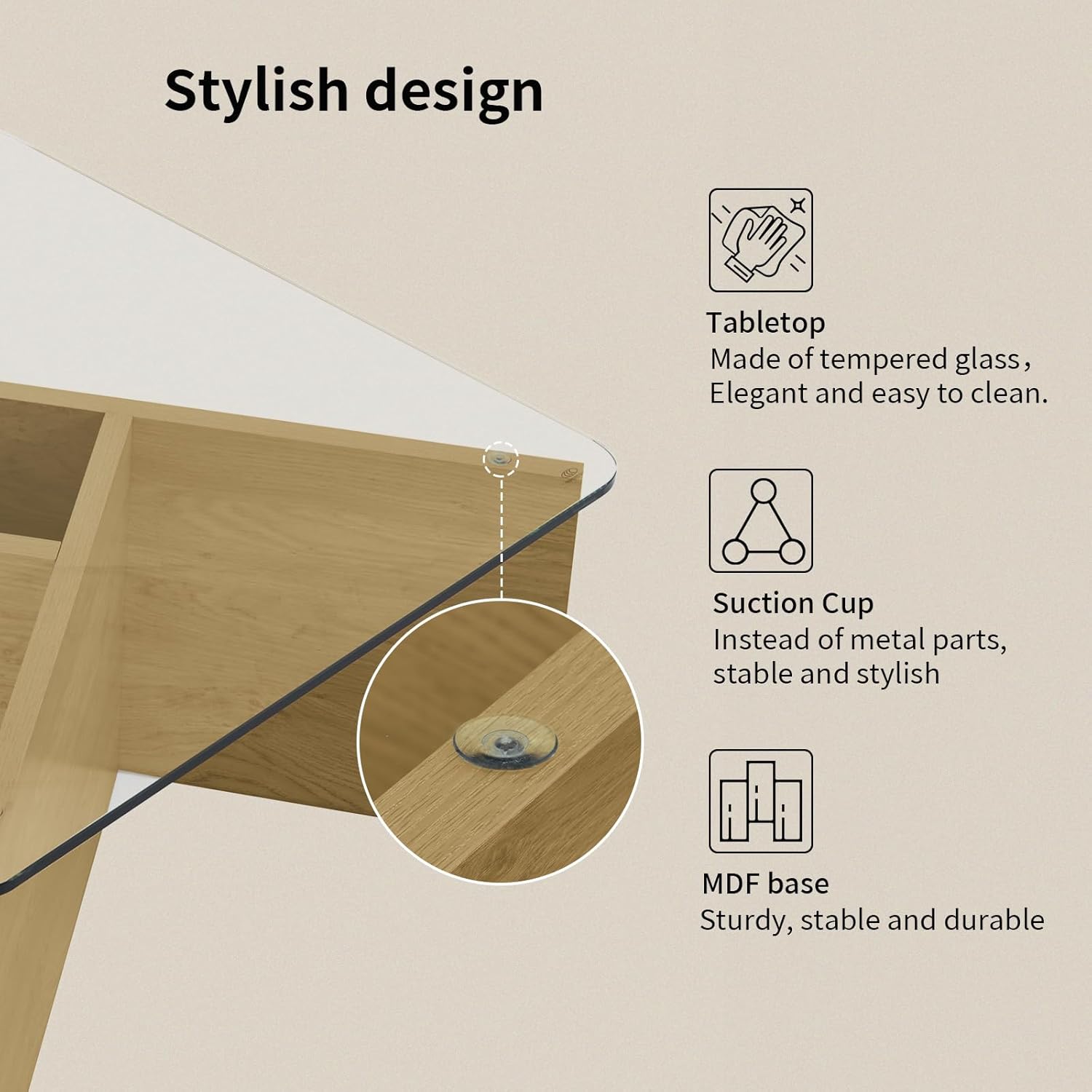 - Suction Disc Tight Connection: The glass coffee table legs are tightly connected to the tabletop using suction discs, ensuring stability and a secure connection