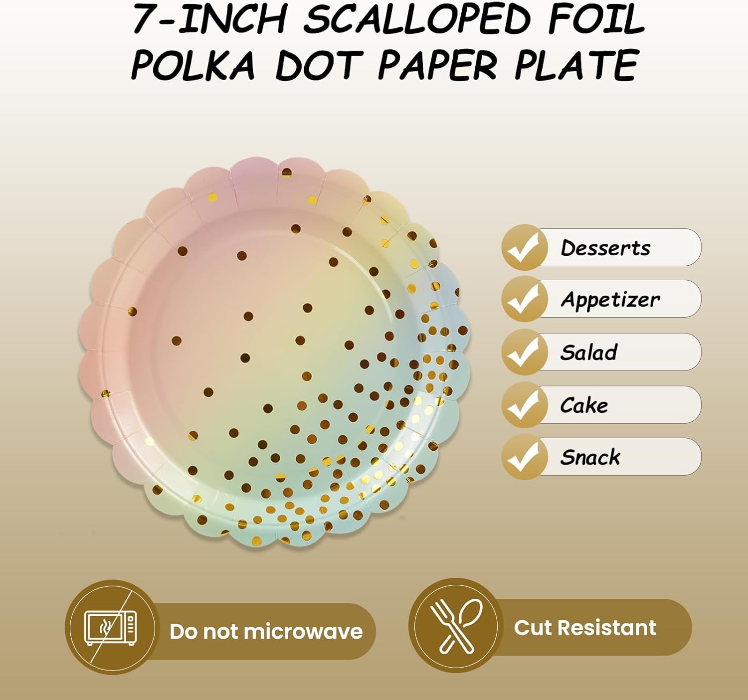50PCS Pastel Rainbow Paper Plates, 7 Inch Scalloped Colorful and Gold Dot Party Plates Disposable Dessert Plate Cake Plate Pastel Party Supplies Decorations for Birthday Aniversary