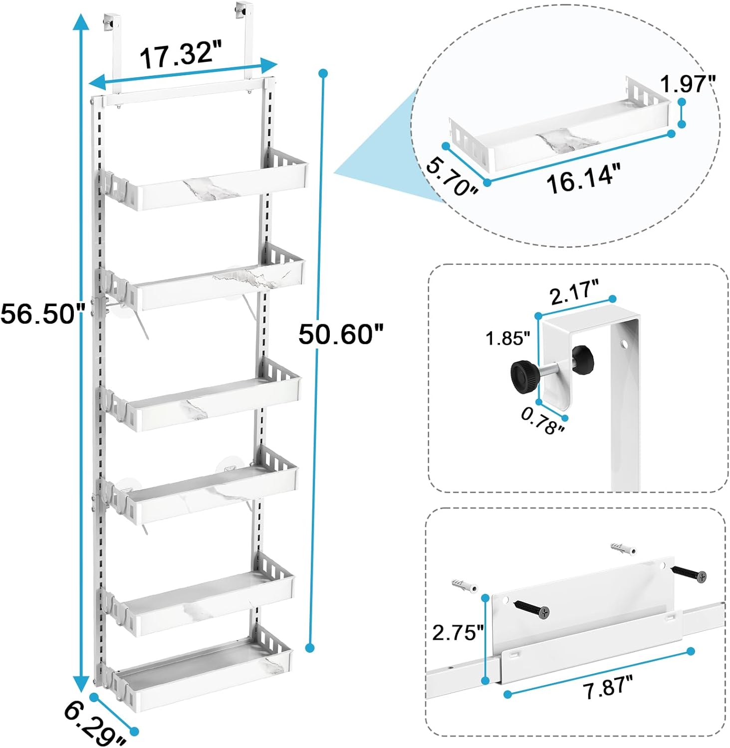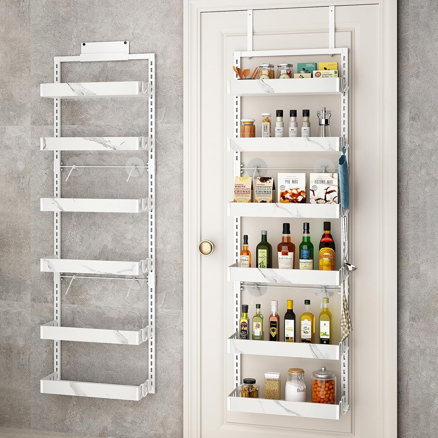 bukfen Over the Door Pantry Organizer, 6-Tier Adjustable Basket Kitchen Pantry Door Organization and Storage, Heavy-Duty Metal Hanging Kitchen Spice Rack,D6.3 x W17.32 x H50.60 inch,White Marble Color