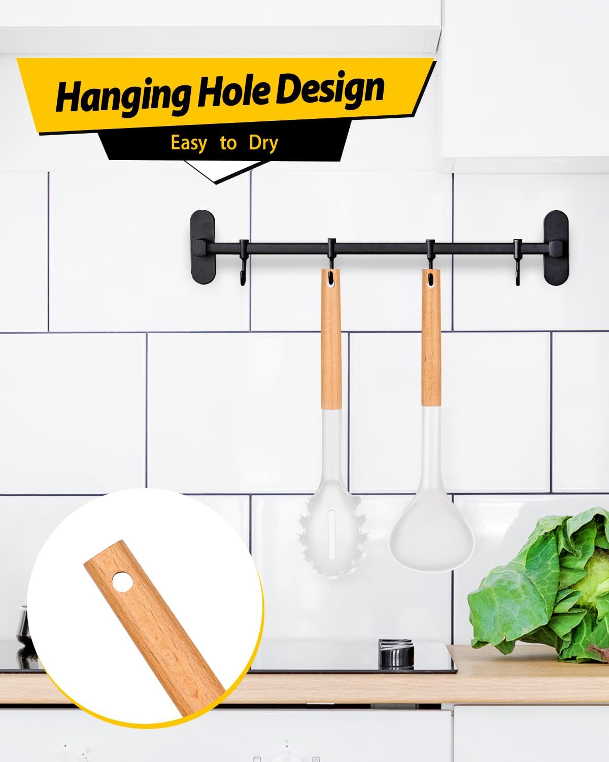 Silicone Pasta Fork and Ladle Spoon Set with Wooden Handle, Heat Resistant Non Stick Kitchen Utensils for Cooking, Stirring, Serving Spaghetti, Soup, Sauce(WHITE)