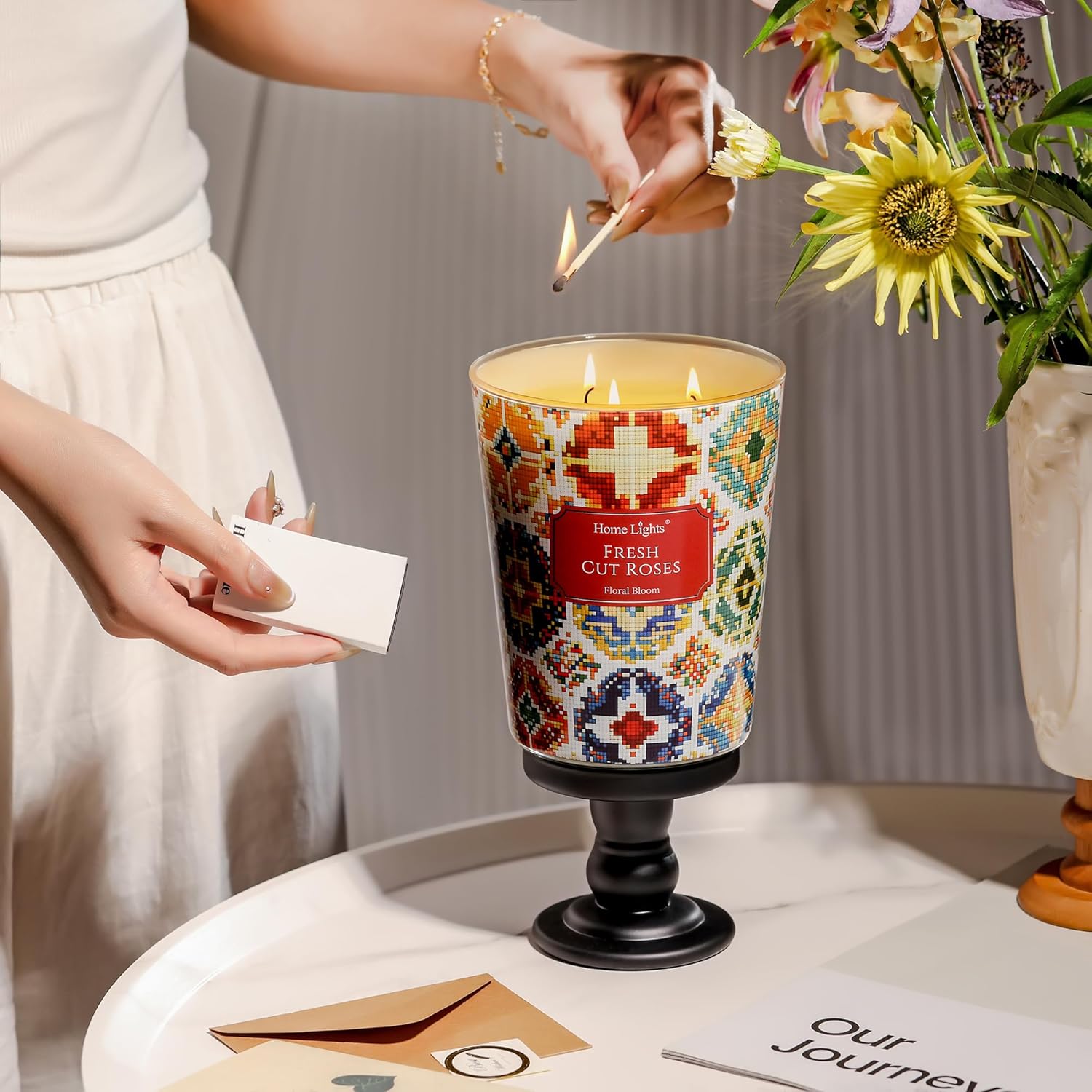 HomeLights 3-Wick Candles for Home Scented - 34oz Soy Wax Blend Candle Long-Lasting Fragrance, Bohemian Natural Textures Home Decor and Housewarming Gifts, Fresh Cut Roses
