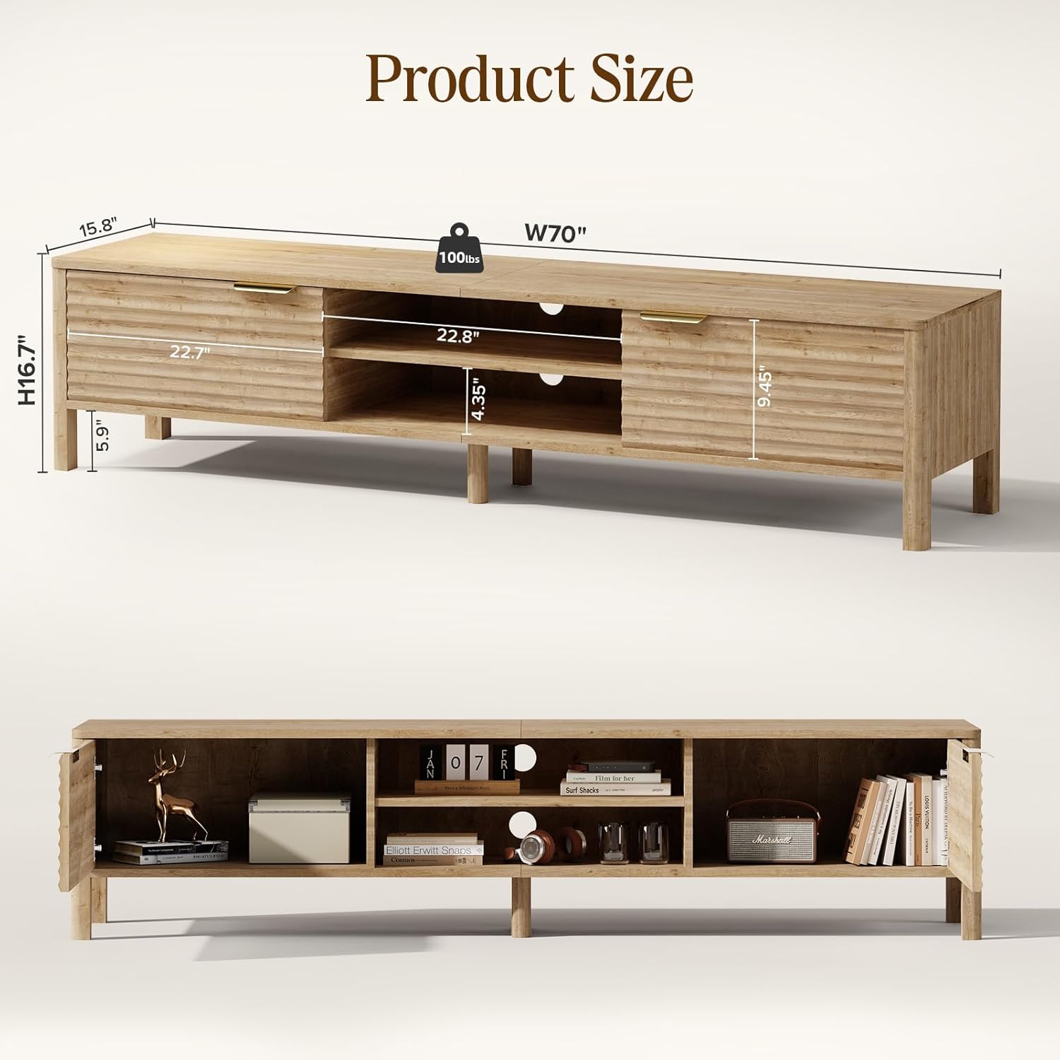 - Elevate Your Space: This 70" TV stand blends mid-century modern style with functional design. Features elegant fluted swing doors and curved legs for a sleek look in any living room or bedroom