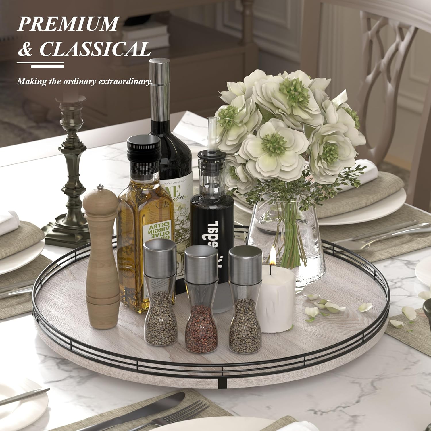 - PREMIUM MATERIAL: Our farmhouse large lazy Susan organizer is made of natural wood and strong Iron, sturdy, durable and premium quality. This wooden turntable organizer is a game-changer for keeping your kitchen organized. The farmhouse finish gives it a rustic, charming look that will fit perfectly with your kitchen decor.
