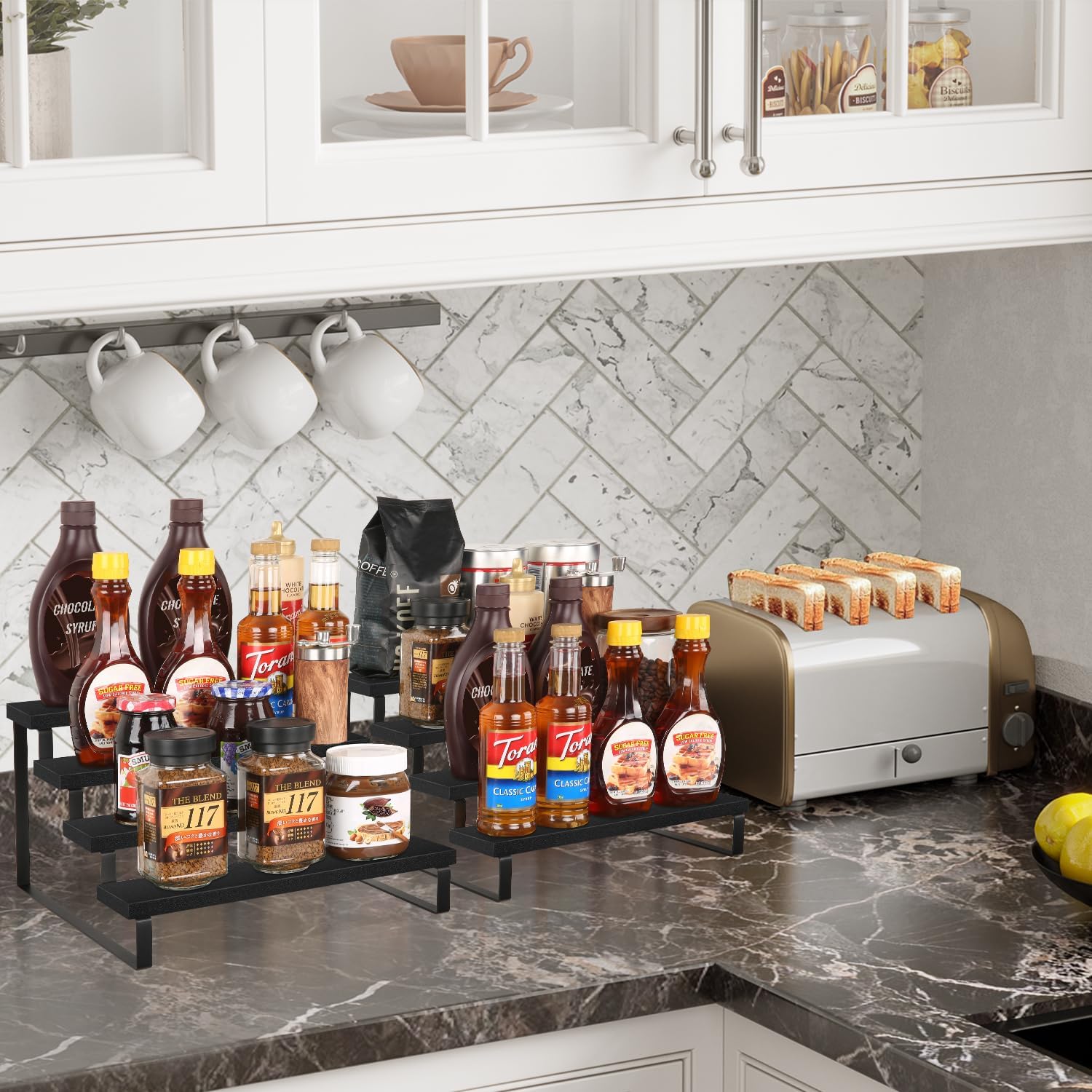 YINMIT Wooden Display Riser Stand, Tiered Perfume and Cologne Organizer Stand, 4 Tier Spice Rack Organizer, Rustic Display Shelf for Candles (4 Tier,2Pack,Black)