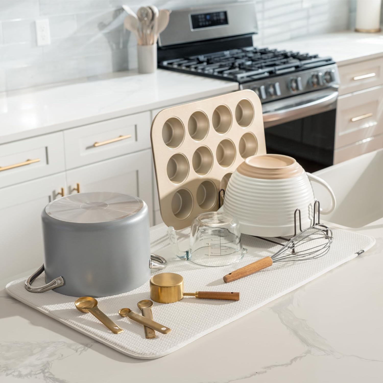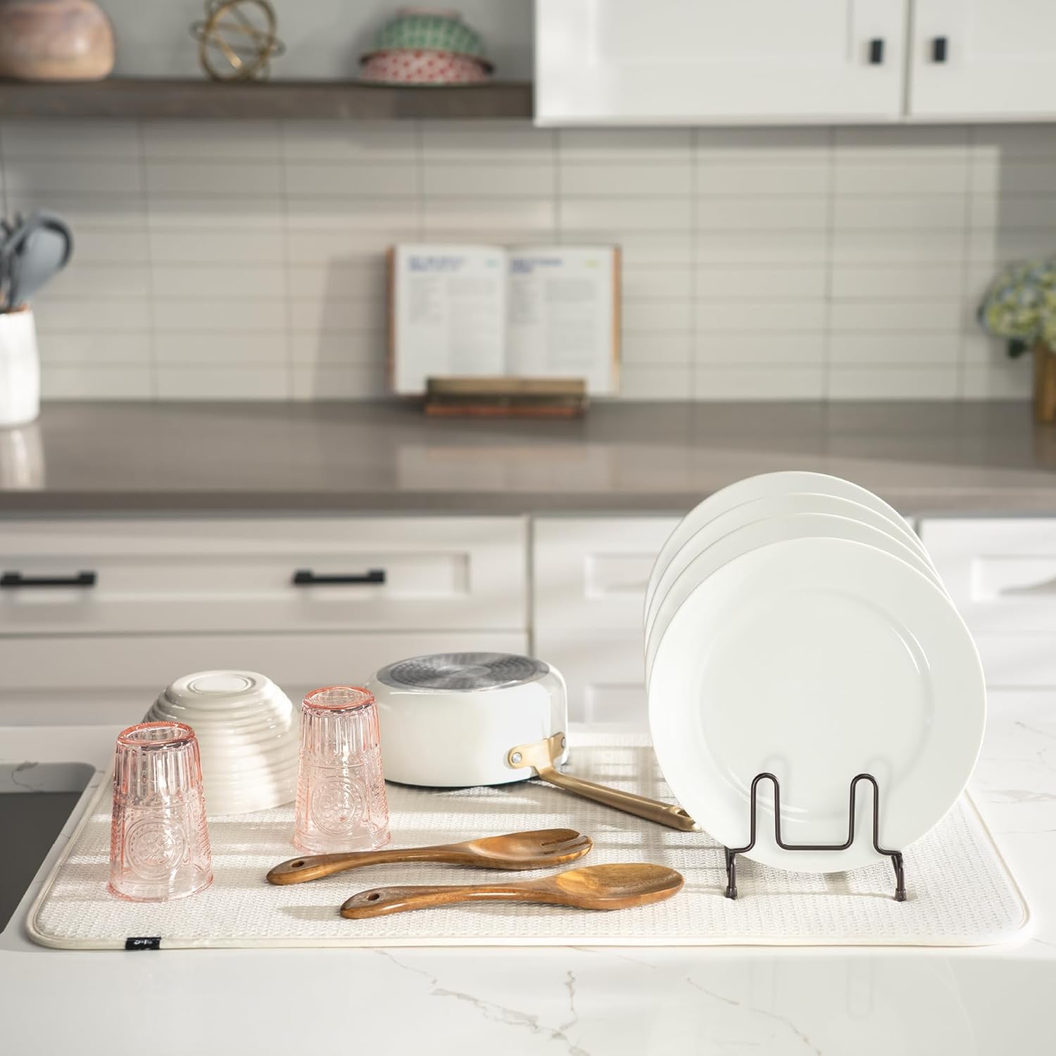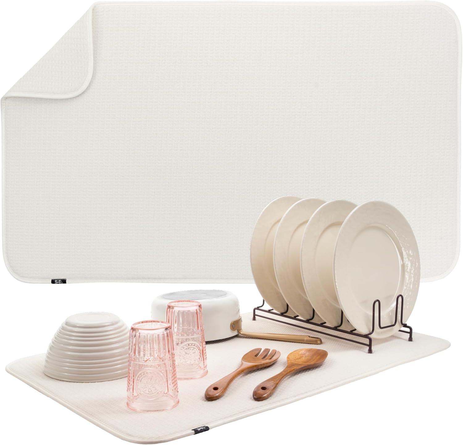 S&T INC. Dish Drying Mat Jumbo, 18” x 30”, Absorbent Microfiber Kitchen Counter Mat, Dish Drying Pad for Dishes, Utensils, Pots and Pans, Jumbo, Cream