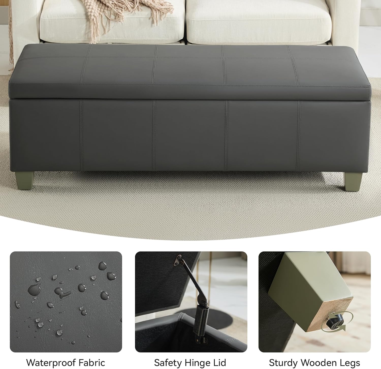 51" Faux Leather Storage Ottoman, Stitch Tufted Rectangle Upholstered End of Bed Storage Bench, Entryway Large Couch Ottoman with Wooden Legs,Dark Grey