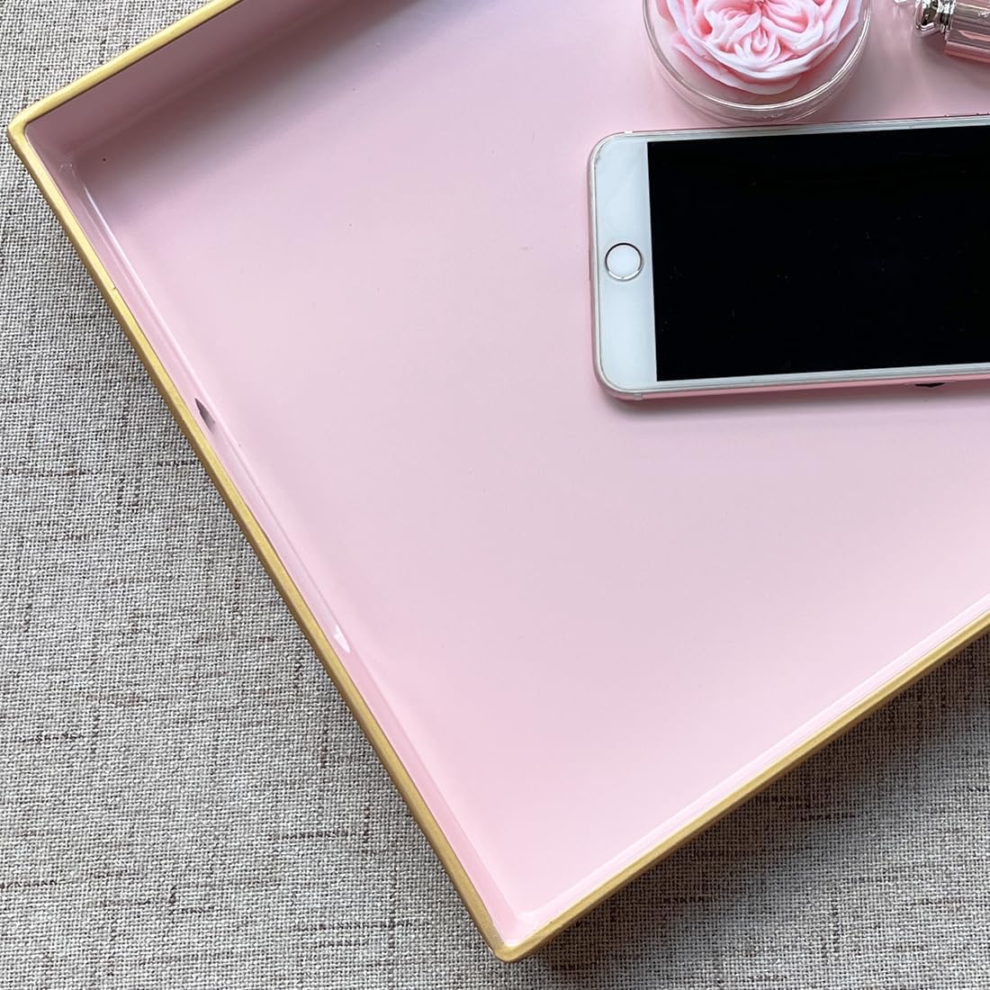 - Design: The size of the Pink tray is 15.7 x 11.8 inches, and it has two built-inhandles for easy carrying. lt has asimple, solid color finish with agolden top rim accent, and theedges are relatively smooth.
