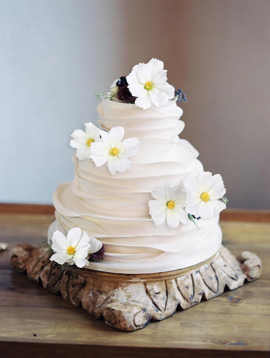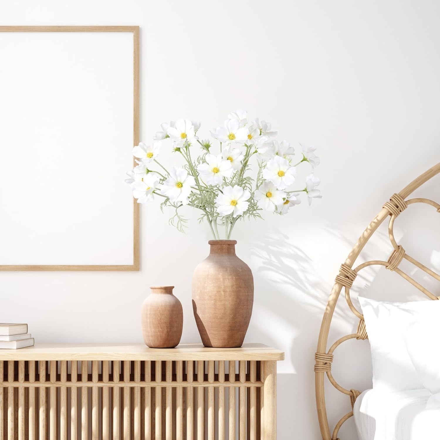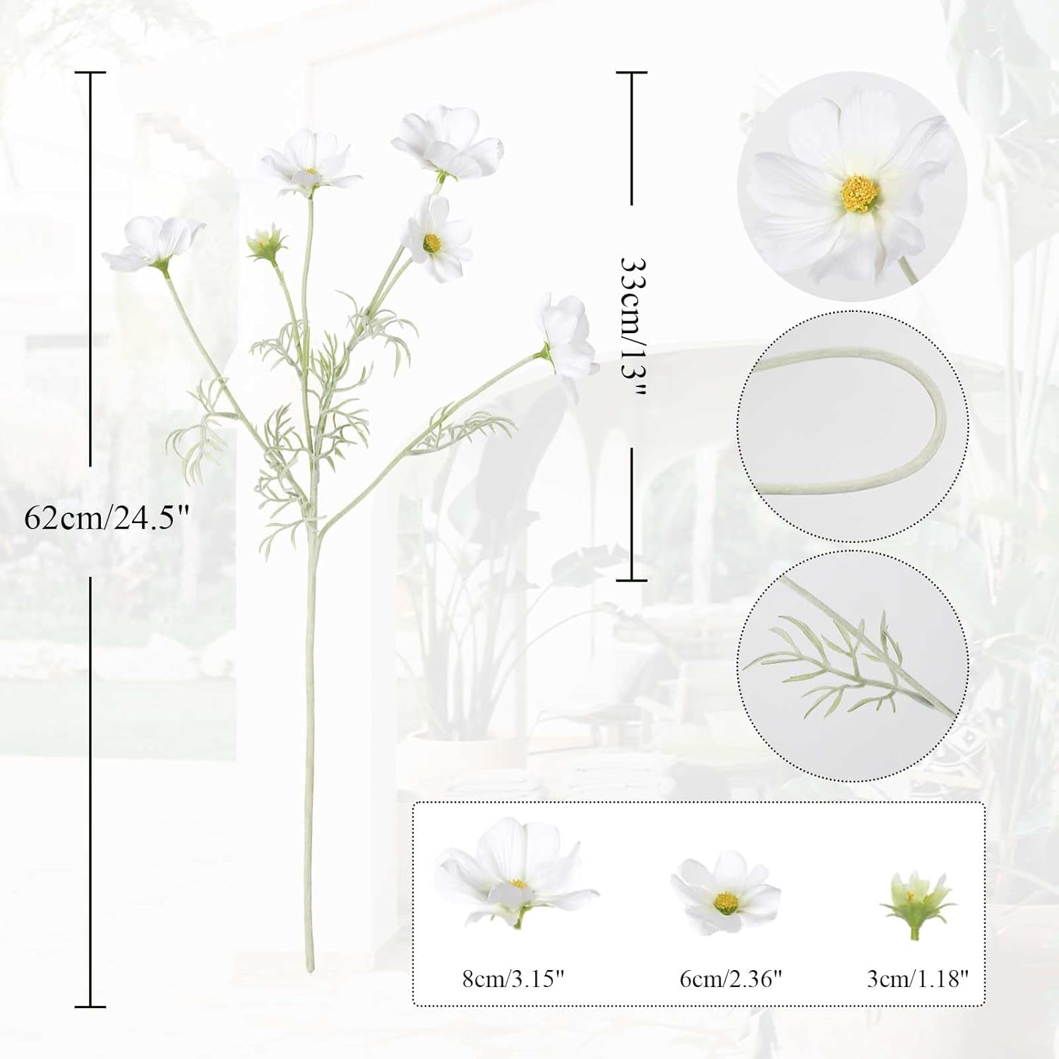 - Quantity and Size: Packed 5PCS white cosmos artificial flowers. Total approx. 24.5inches/62cm height, bigger daisy flower 3.15β/8cm, smaller 2.36'' /6cm, cosmos bud 1.18β/3cm. Each daisy flowers artificial wildflowers set with 4 large flower heads, 1 small and 1 bud, total with 30 flowers heads. The long stem artificial flowers is ideal for your tall flowers for floor vase floral arrangements