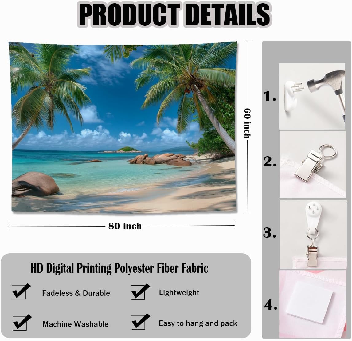 - Tropical Beach Summer Vibes: Bring the relaxing atmosphere of a seaside paradise into your space with this tropical beach tapestry. Featuring palm trees, blue sky, and ocean waves, it's perfect for summer-themed rooms or coastal decor lovers