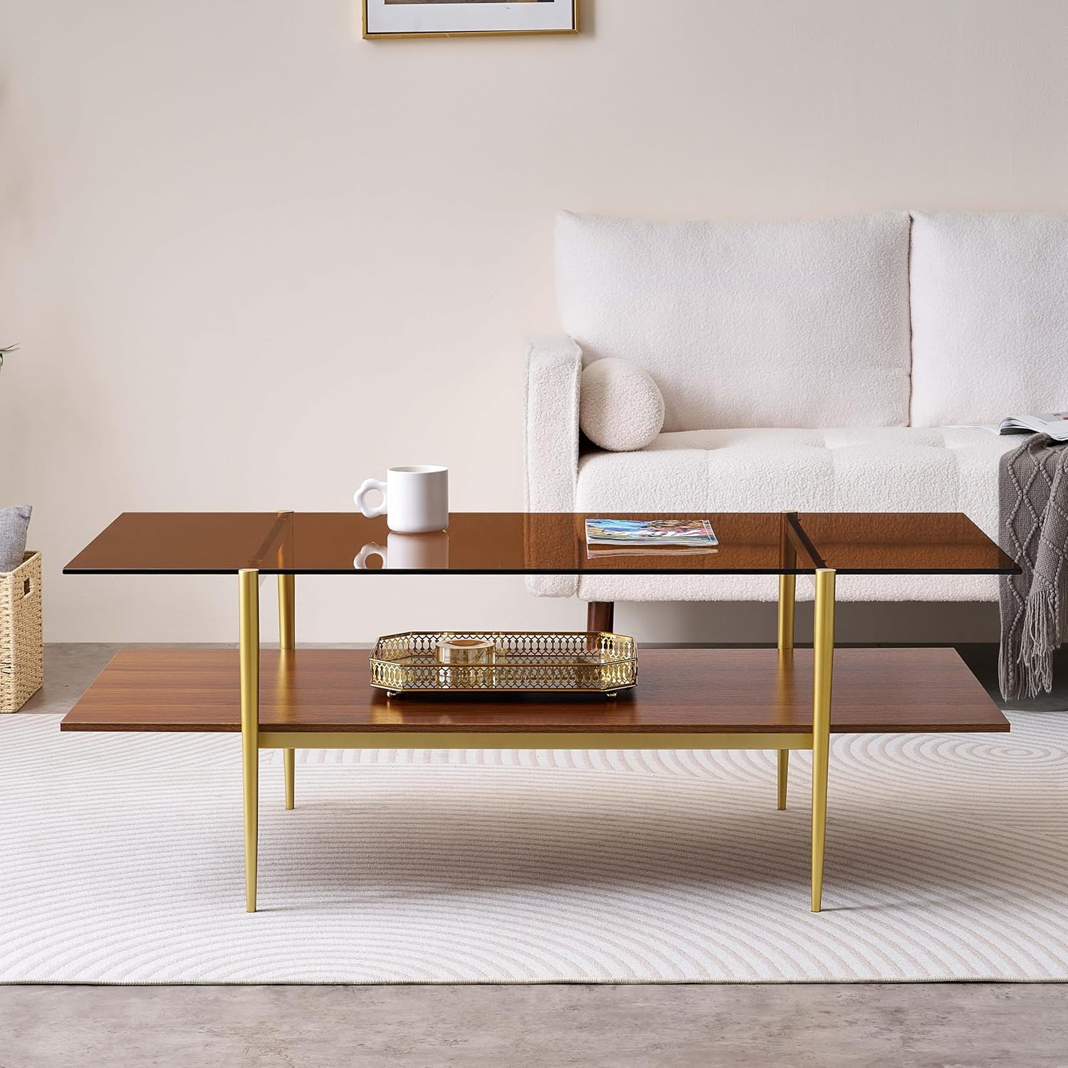 Extra Large Rectangle Glass Coffee Table, Mid-Century Modern Design for Living Room, L47 x W24 x H17, Amber Glass Top and Walnut MDF Shelf, Sleek Conical Metal Legs with Gold Finish