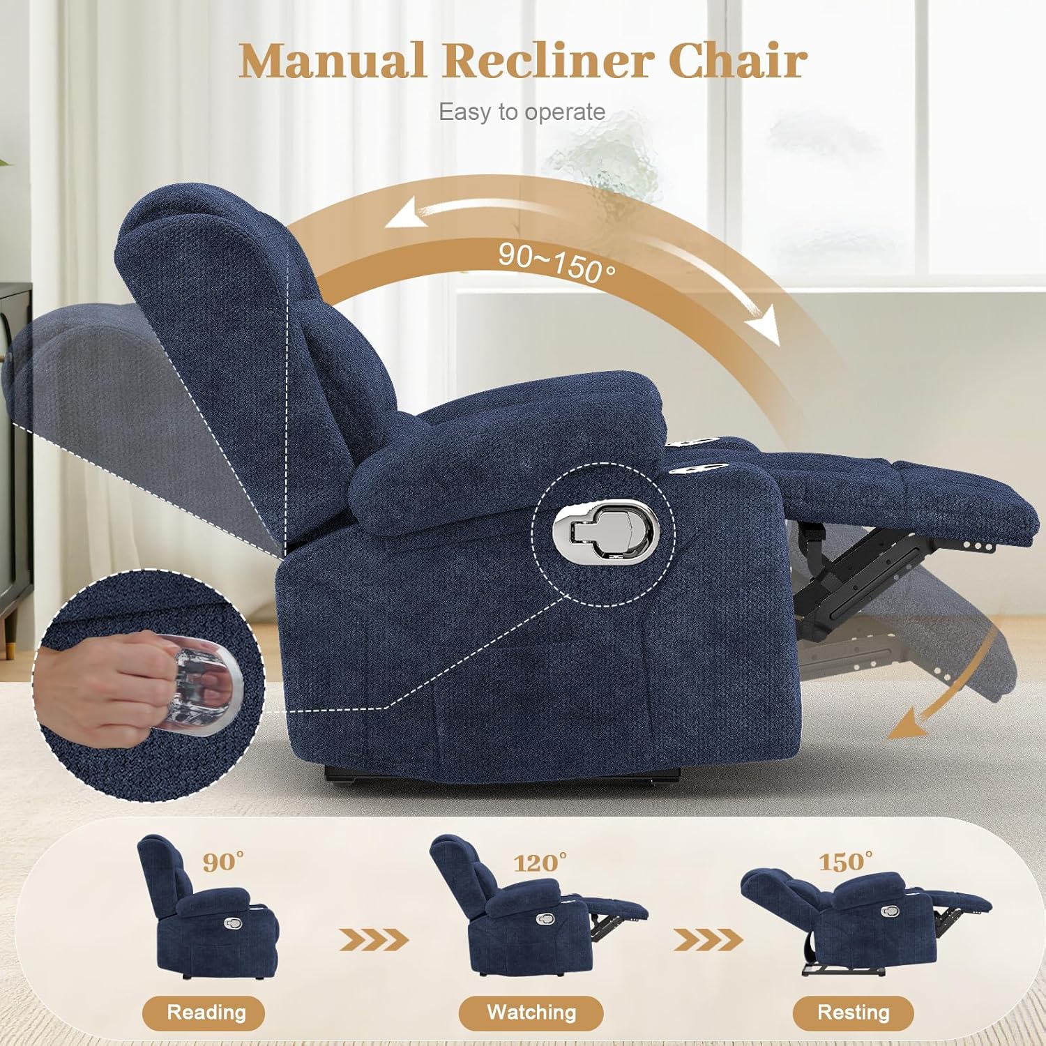 Recliner Chair for Adults, Oversized Fabric Manual Pull Tab Reclining Chair with Cup Holders, Minimalist Style Single Sofa for Living Room, RV (Blue)