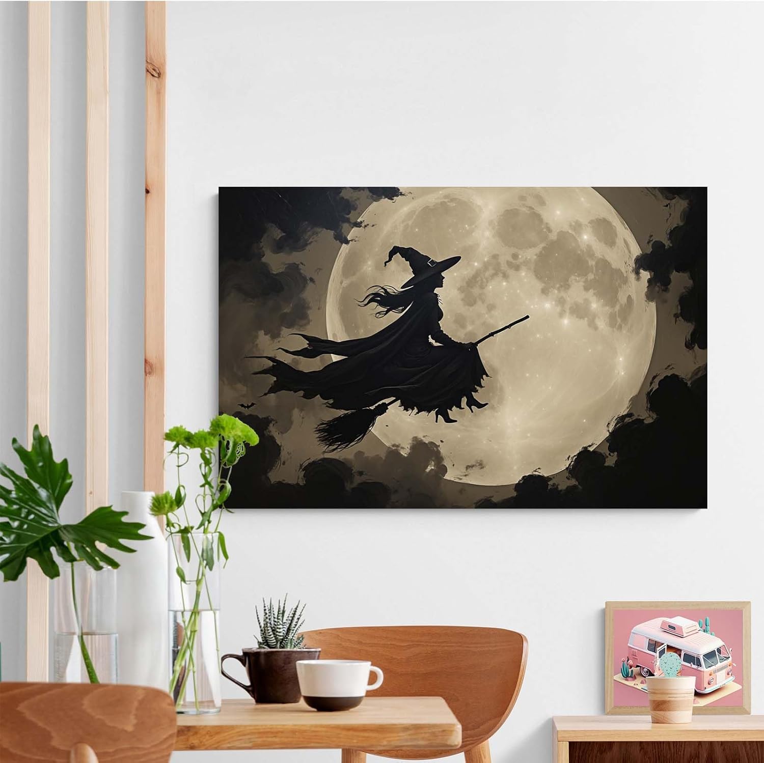 Full moon witch silhouette poster witch on magic broom Halloween mural poster decorative mural art suitable for home living room bedroom16x24in Wood Framed