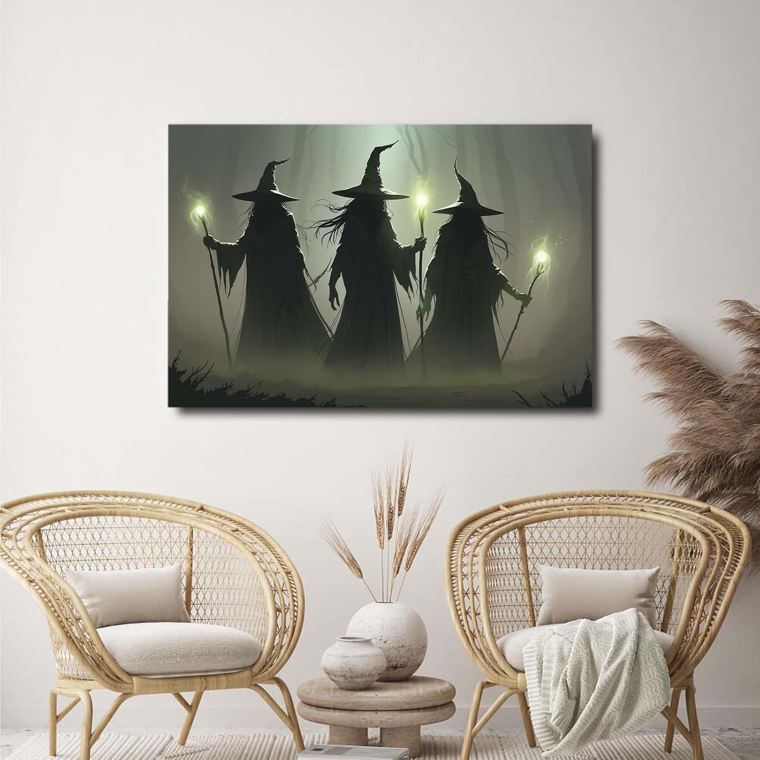 Vintage 3 witches canvas wall decor melancholy dark Halloween poster wall decor holding a staff print Gothic horror Halloween painting print for living room bedroom24x36in Wood Framed