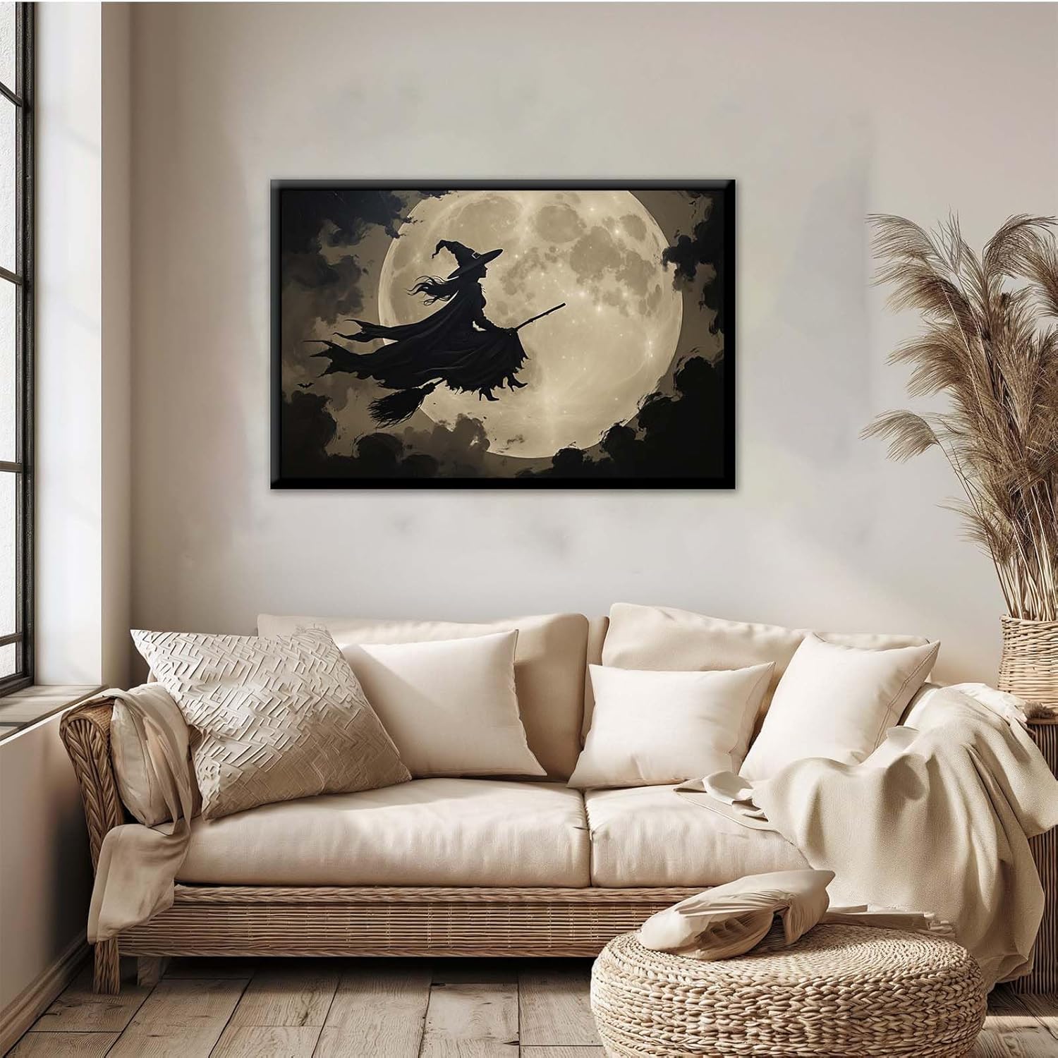 JFHCQJPK Full moon witch silhouette poster witch on magic broom Halloween mural poster decorative mural art suitable for home living room bedroom24x36in Metal blackFramed