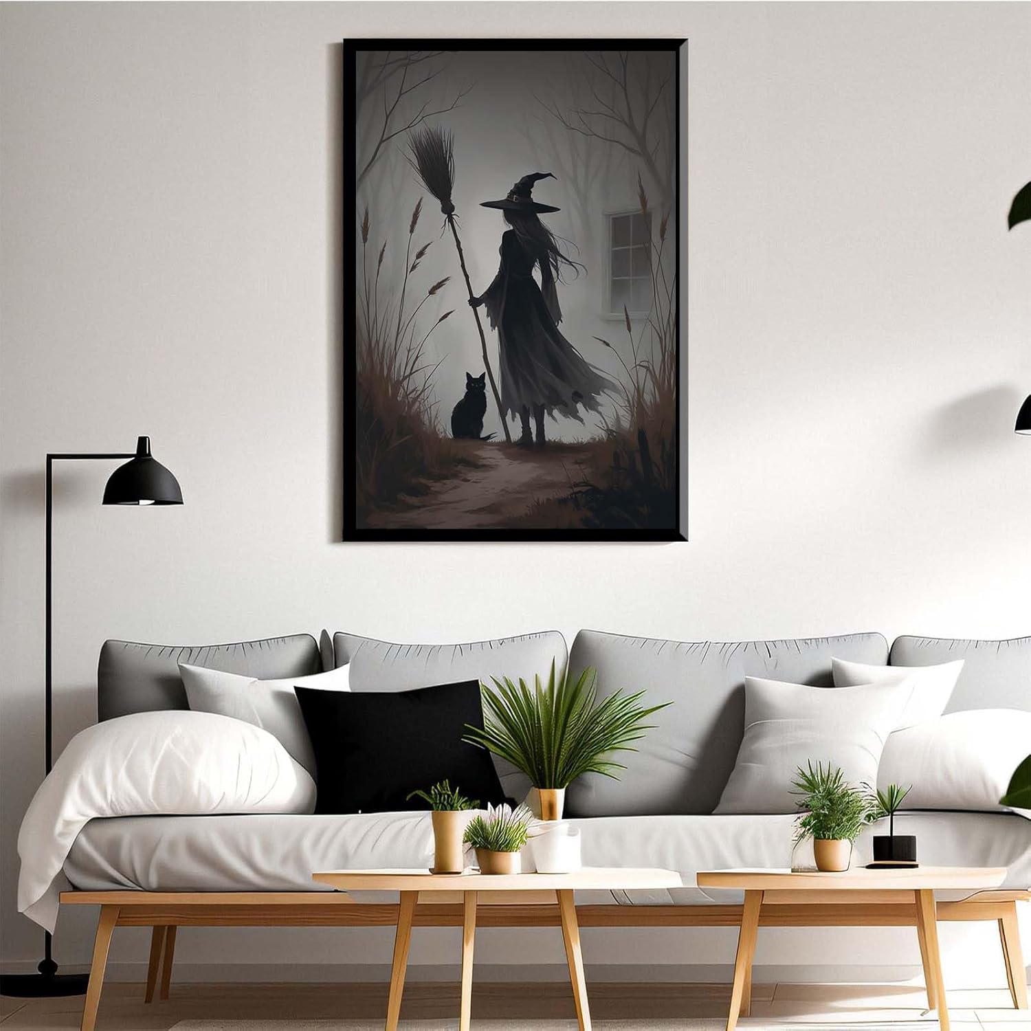JFHCQJPK Vintage forest witch and black cat poster Halloween mural poster decoration mural art magic suitable for home living room bedroom8x12in Metal blackFramed