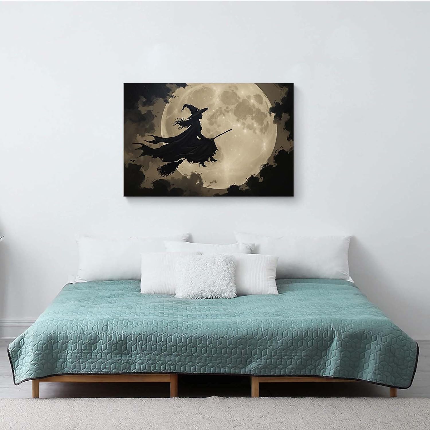JFHCQJPK Full moon witch silhouette poster witch on magic broom Halloween mural poster decorative mural art suitable for home living room bedroom16x24in Frameless