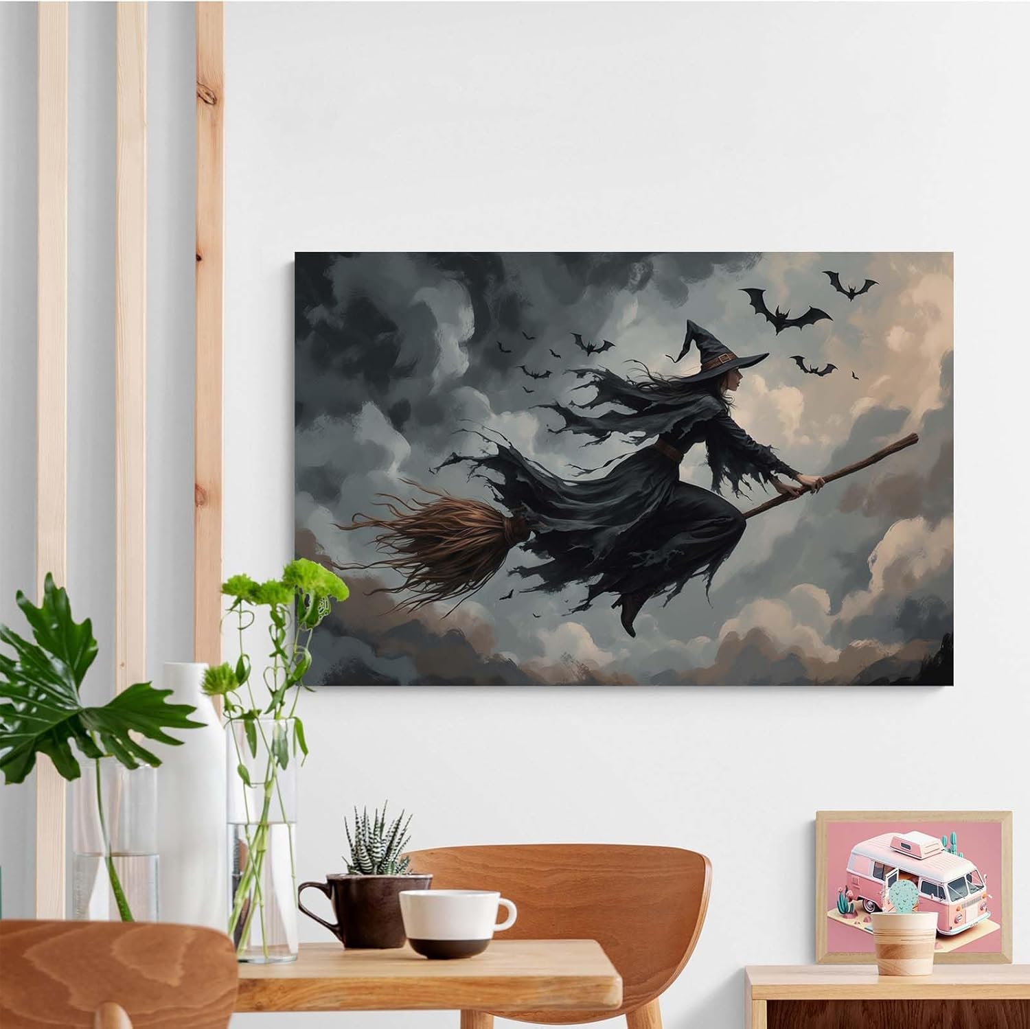 JFHCQJPK Witch and bat flying Halloween poster suitable for home party wall decoration retro Halloween preppy style wall art canvas print suitable for room decoration12x16in Frameless