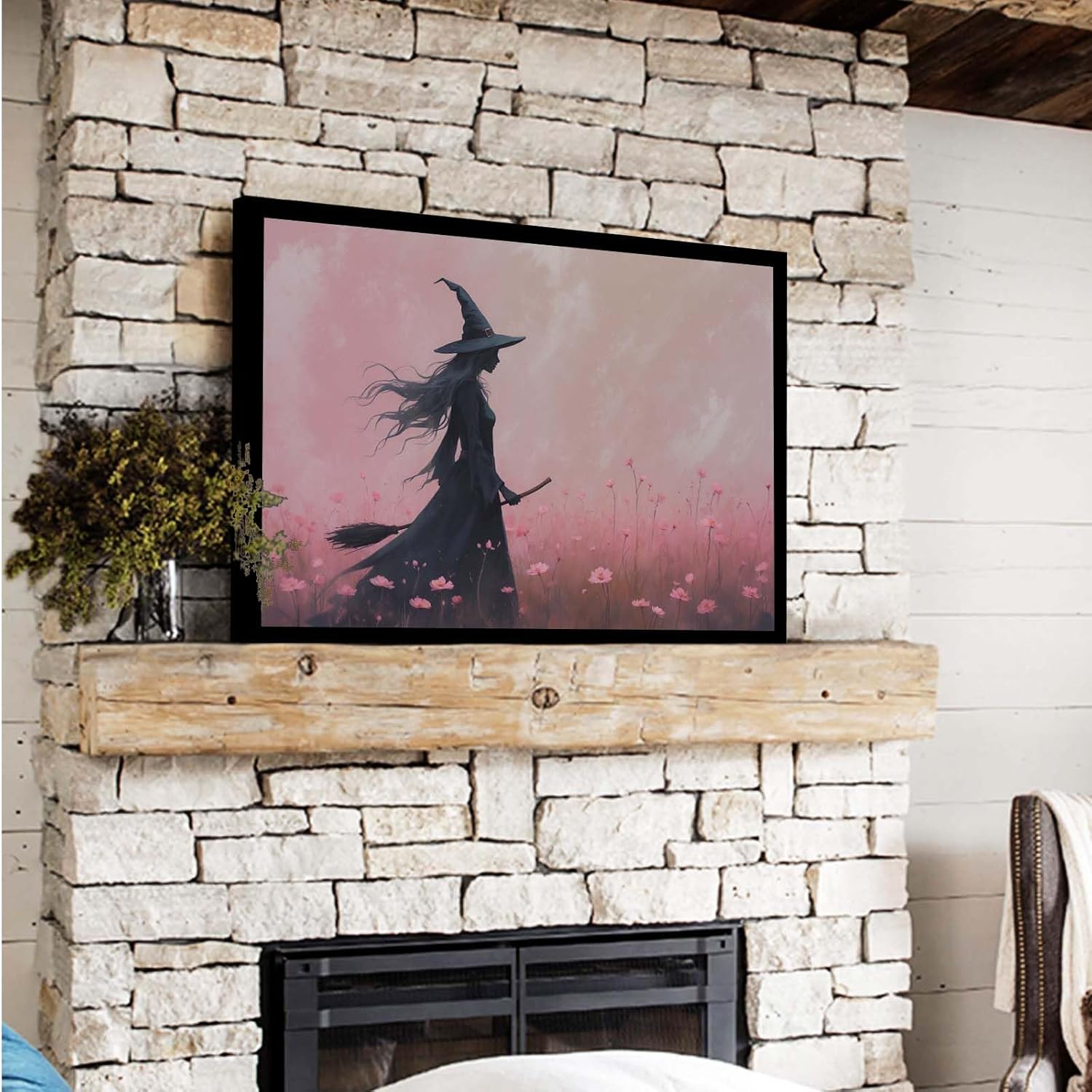 JFHCQJPK Witch in the pink sea of flowers Halloween prints weird flowers wall art silhouette painting fashionable romantic decoration suitable for bedroom8x12in Metal blackFramed