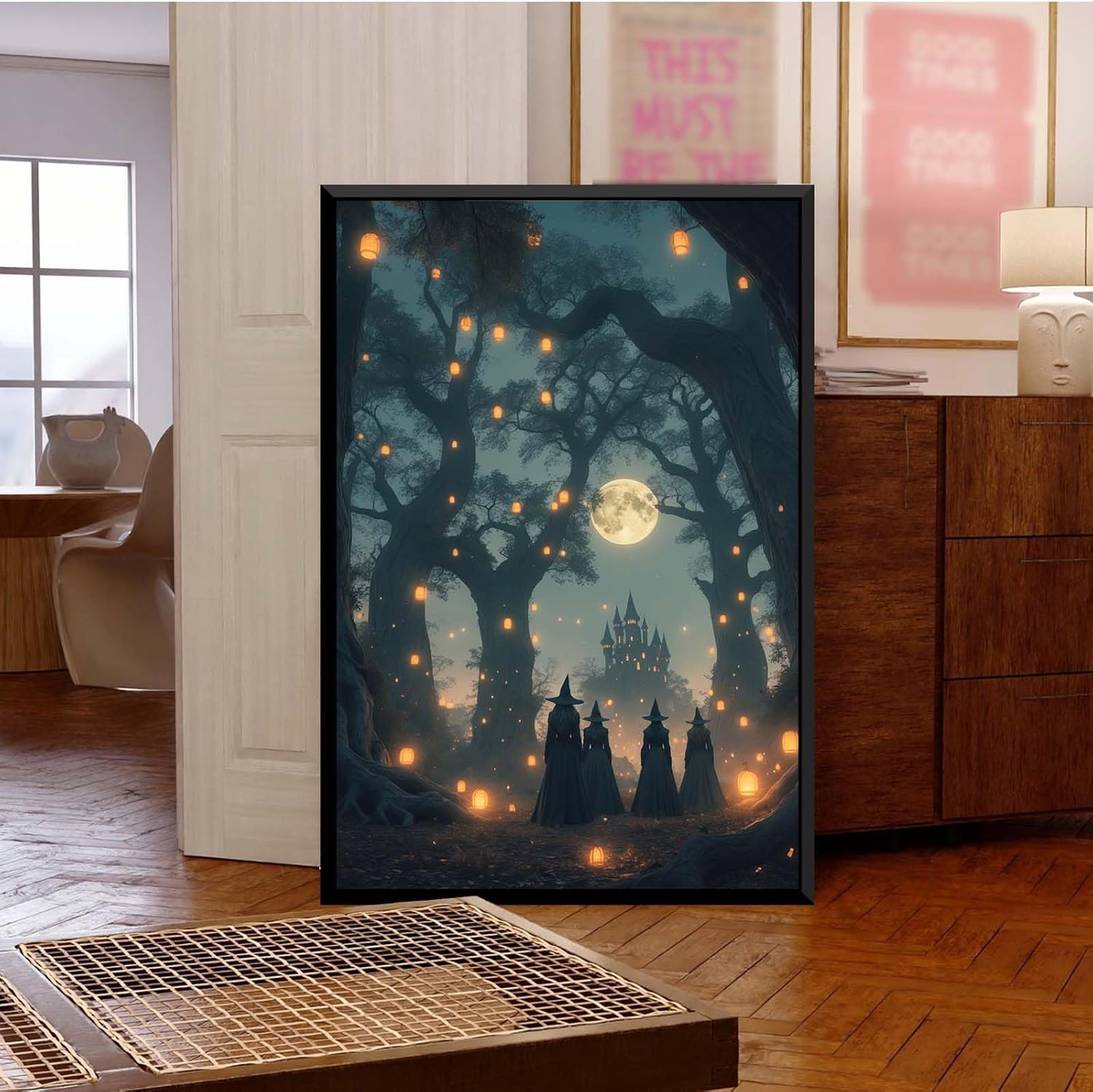 JFHCQJPK Mysterious creek painting witch and castle in magic forest art print canvas gothic print dark college decoration poster for home bedroom12x16in Metal blackFramed