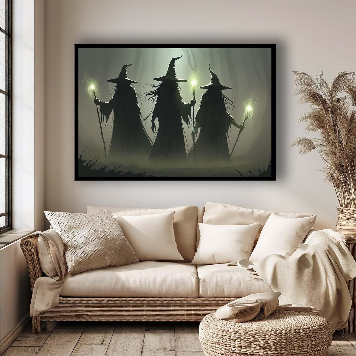 JFHCQJPK Vintage 3 witches canvas wall decor melancholy dark Halloween poster wall decor holding a staff print Gothic horror Halloween painting print for living room bedroom16x24in Metal blackFramed