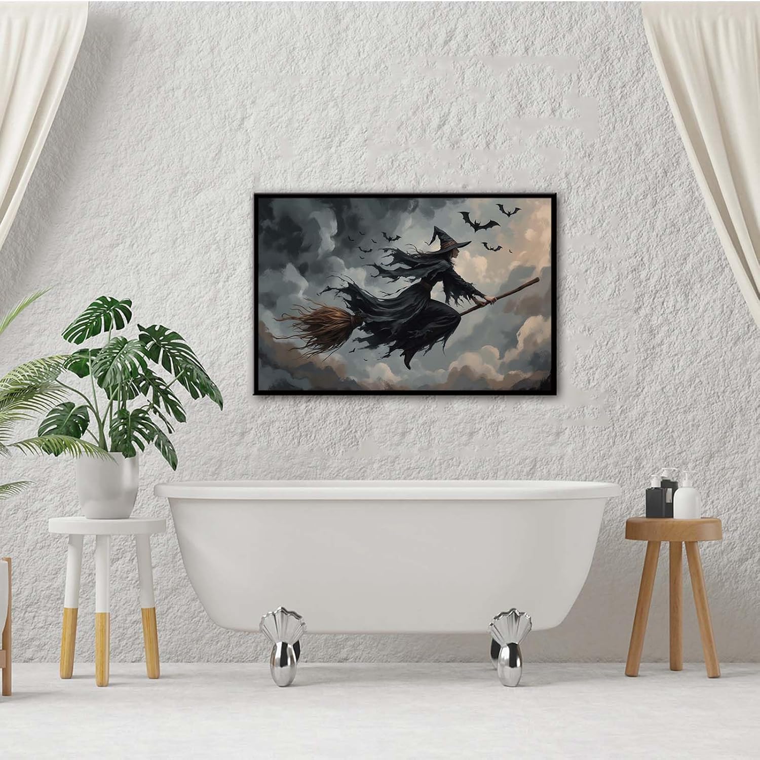 JFHCQJPK Witch and bat flying Halloween poster suitable for home party wall decoration retro Halloween preppy style wall art canvas print suitable for room decoration12x16in Metal blackFramed