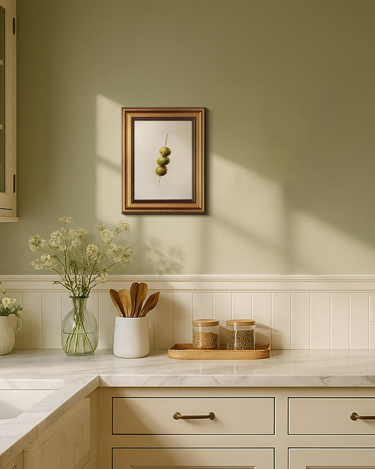 HUARCEY Gold Framed Wall Art for Living Room, Olive Skewers Painting Prints, Vintage Wall Decor for Kitchen, Minimalism Bedroom Wall Art for Home Office A string of olives 10L x 8W