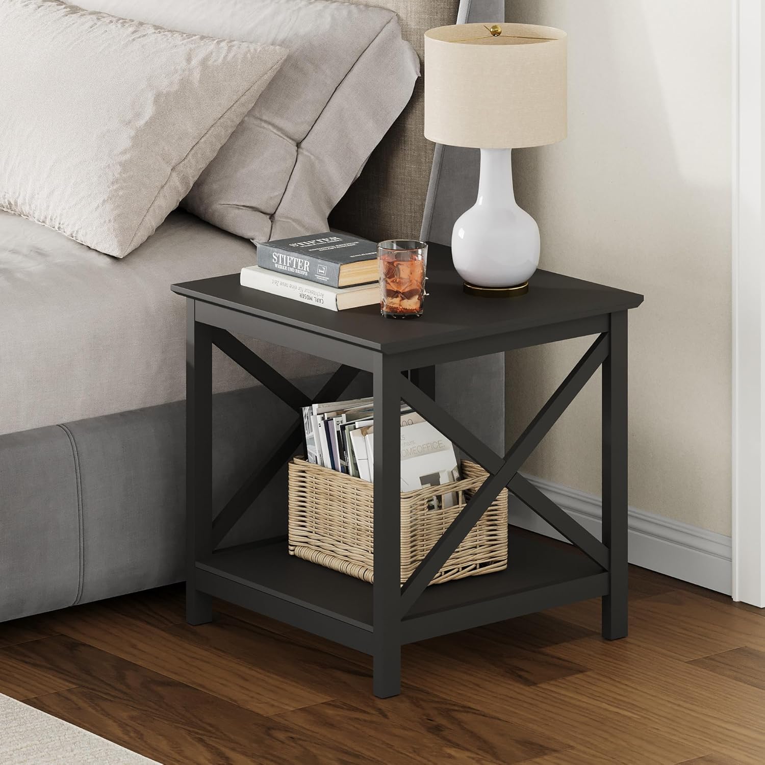 ChooChoo End Table, 24 Inch End Table with 2-Tier Storage Shelf, Side Table for Living Room, Wood Nightstand for Bedroom, Office, Painted Surface, Black