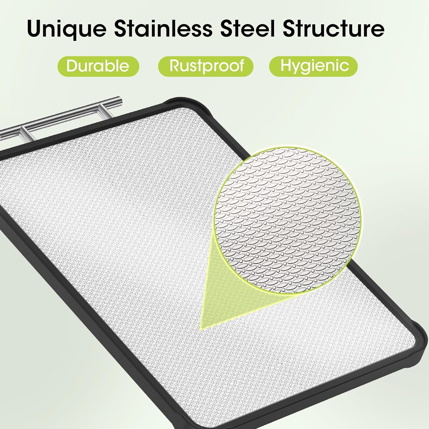 - Dual-Sided Cutting Board โ Smart & Safe Use the stainless steel side for raw meat, fish, or poultry, and the non-slip composite side for vegetables, fruit, or bread. Prevent cross-contamination with one board that does it all.