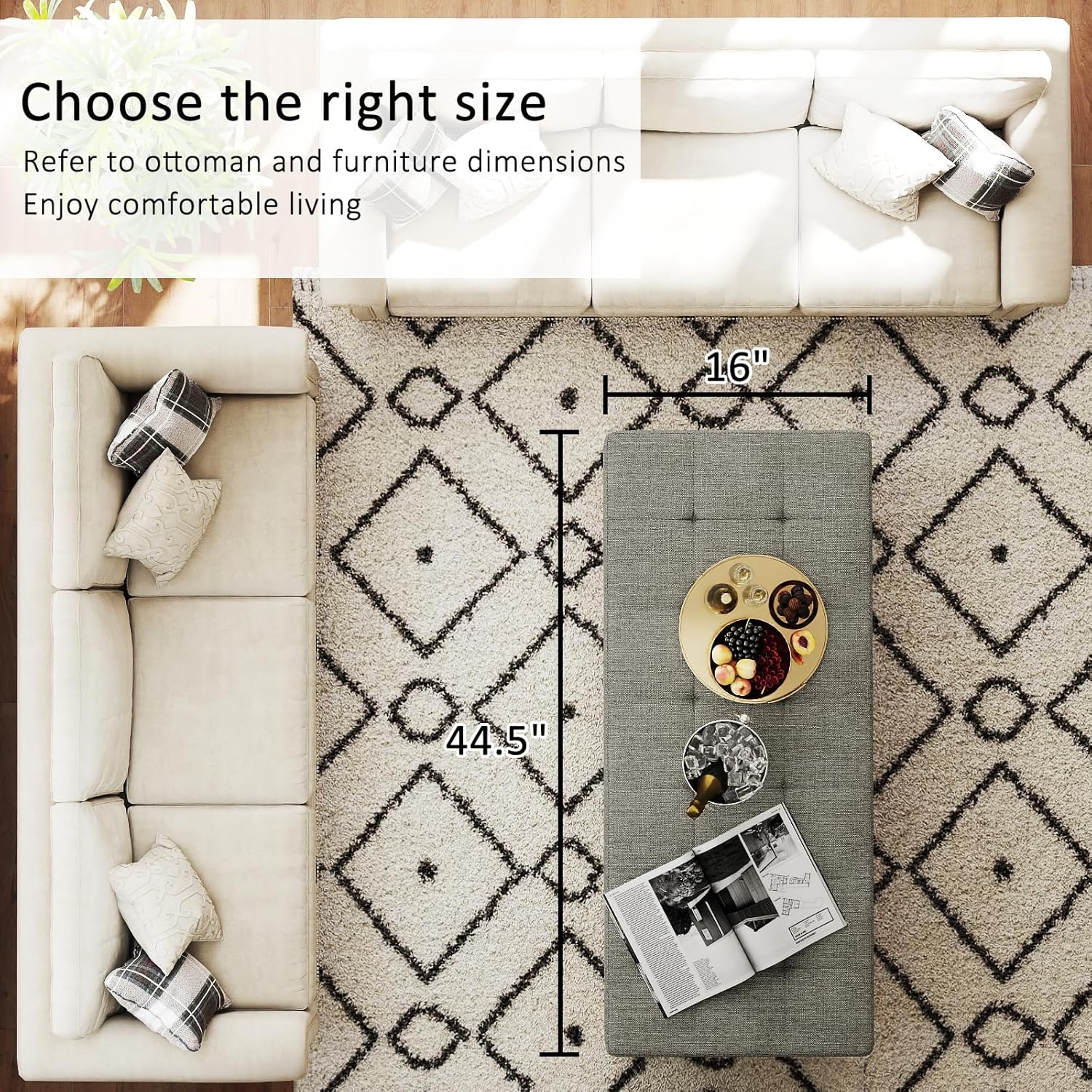 Large Rectangular Upholstered Ottoman Bench, Linen Tufted Footrest Ottoman with Solid Wood Shelf Storage Coffee Table for Bedroom Living Room, Granite