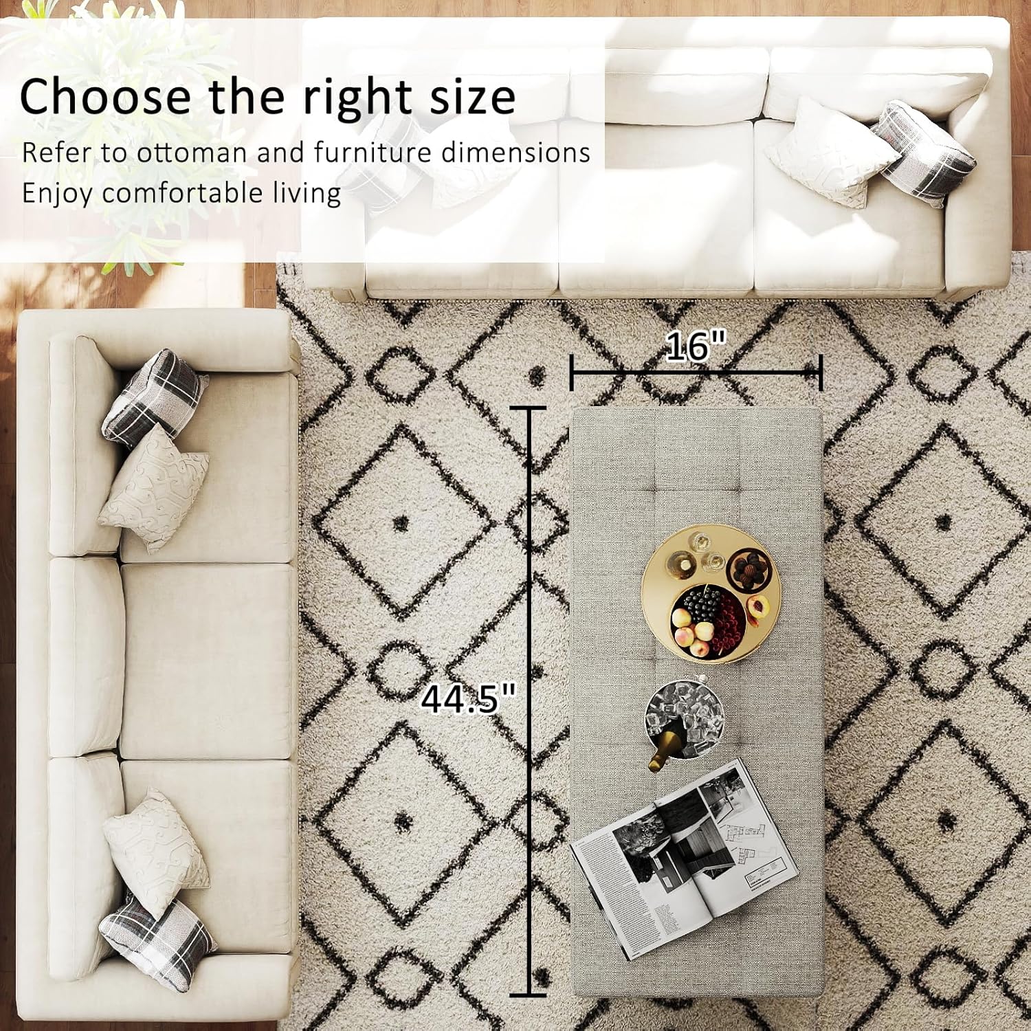 Large Rectangular Upholstered Ottoman Bench, Linen Tufted Footrest Ottoman with Solid Wood Shelf Storage Coffee Table for Bedroom Living Room, Linen