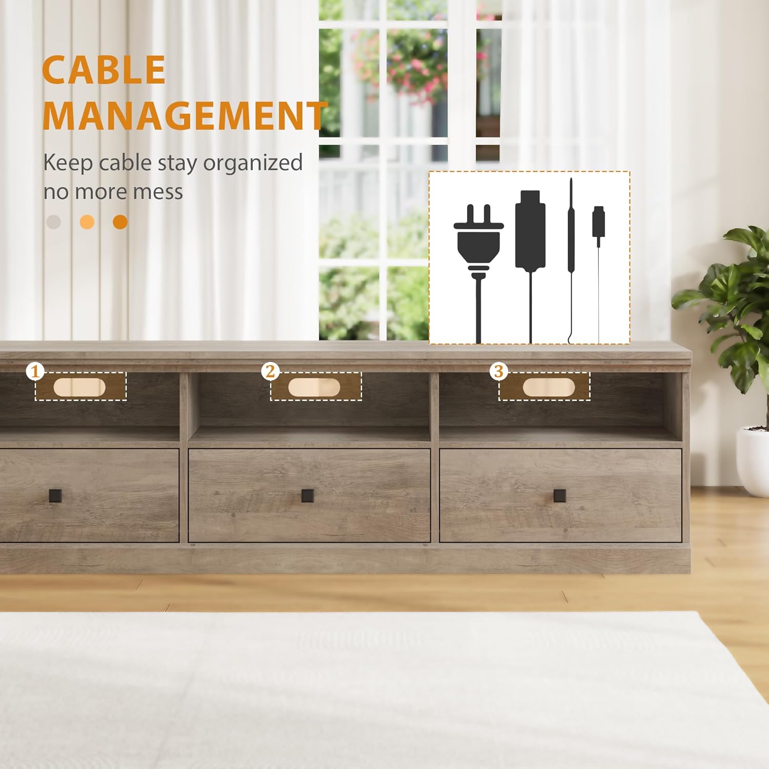- CABLE MANAGEMENT: This entertainment stand features 3 metal handles for a sophisticated touch. The drawers open smoothly and quietly for easy access, keeping your space organized and clutter-free. With 3 cable holes at the back, this tv entertainment center effectively conceals cables for a tidy, streamlined appearance