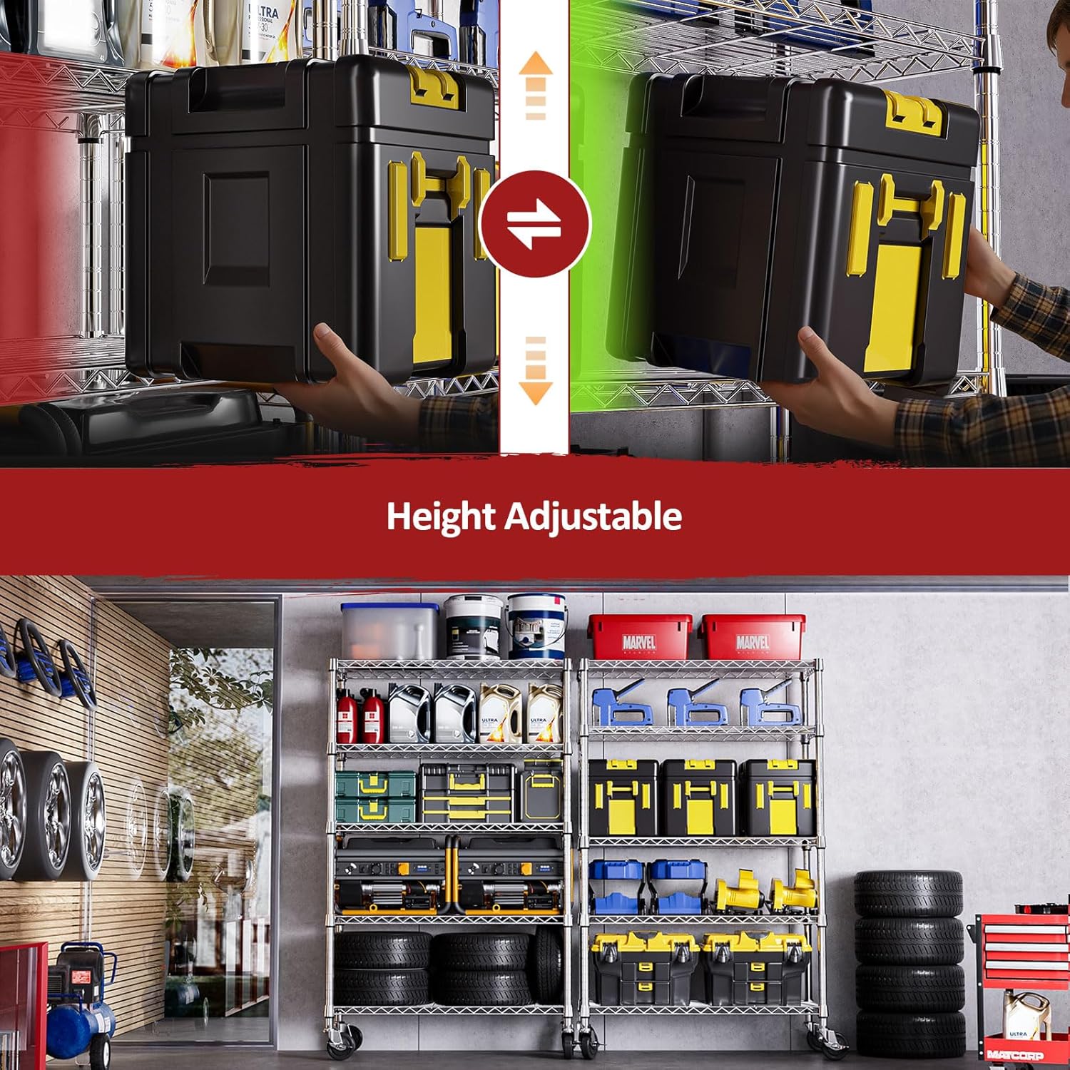 - ăAdjustable Shelves & 360° Lockable WheelsăCustomize the height of each shelf in 1-inch increments to fit everything from large appliances to small bins. Equipped with 4 smooth-rolling 360° caster wheels (2 with locks), this unit offers maximum mobility and stabilityâeffortlessly move it around your home, garage, or office, and lock it in place when needed.