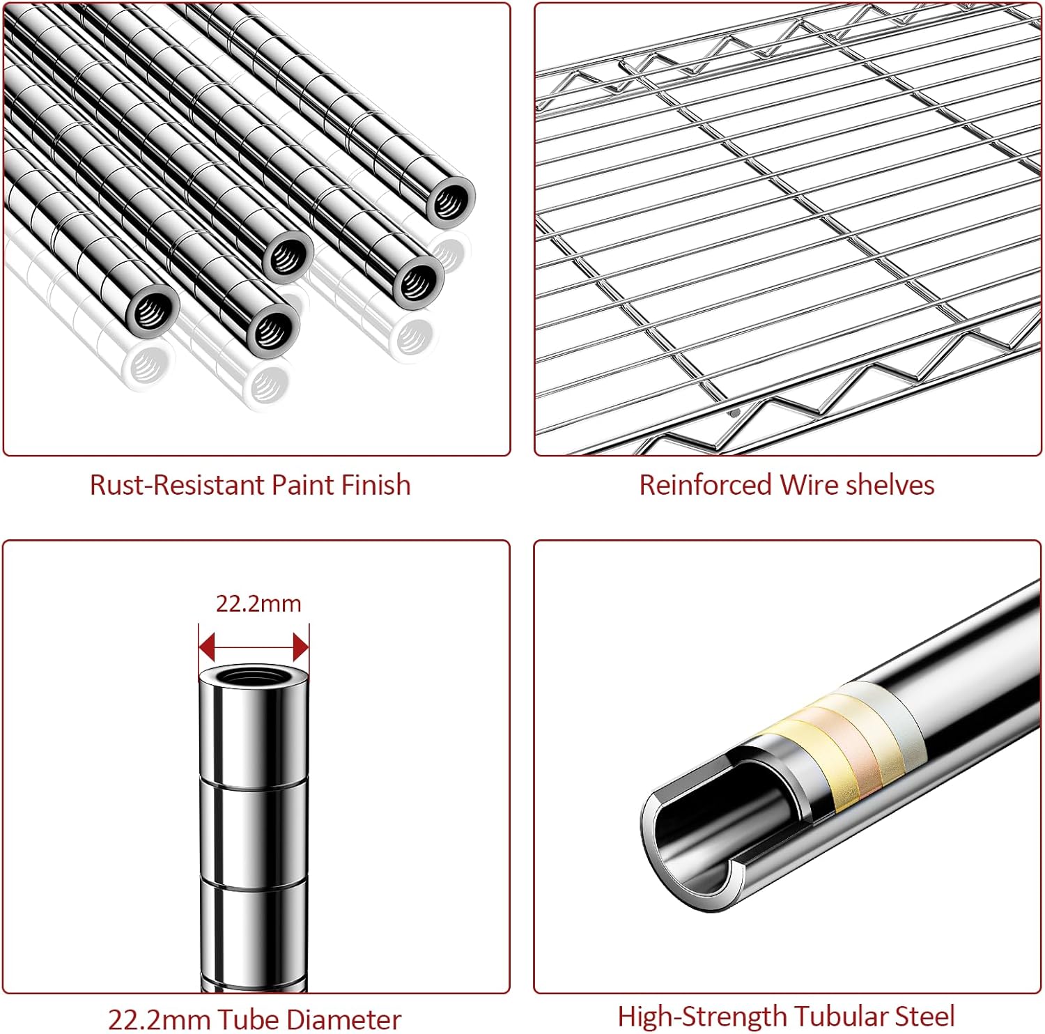 - ăAdjustable Shelves â Flexible for All NeedsăCustomize your storage your way. Each shelf can be easily adjusted in 1-inch increments to fit items of varying sizesâfrom bulky tools to compact kitchenware. This wire shelving unit adapts to your unique storage needs, creating a more organized and efficient space.
