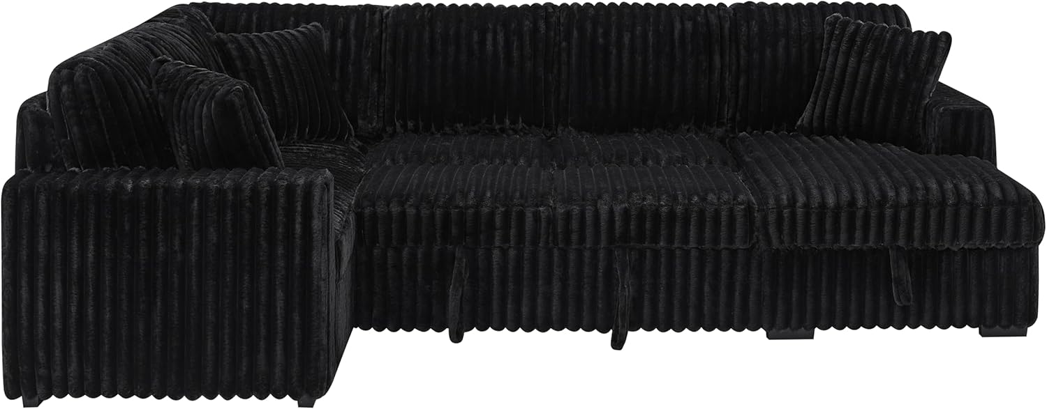 THSUPER 122-Inch Oversized U Shaped Plush Corduroy Fluffy Sectional Sleeper Sofa with Pull Out Bed, Storage Chaise Lounge and USB Charging Port - Black