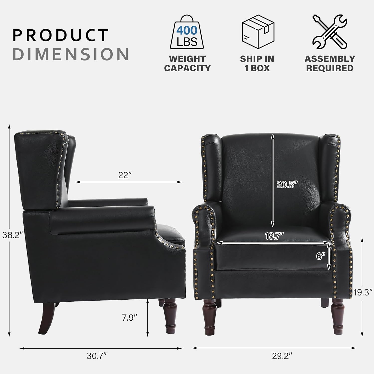 - Product Size: This accent chair measures 30"D x 29"W x 38"H and the seat measures 22"W X 19"D X 6"H