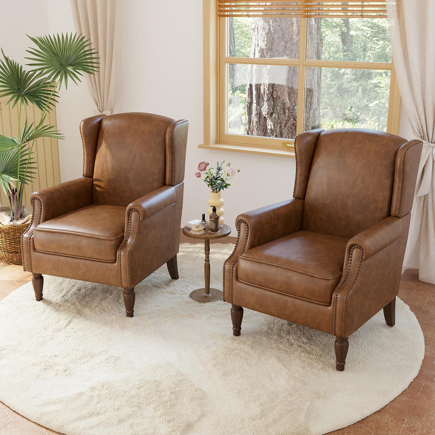 Accent Chairs, Faux Leather High Back Armchair setof 2 or Living Room, Comfy Upholstered Single Sofa Reading Chairs with Solid Wood Legs for Office, Bedroom, Waiting Room-Leather Brown