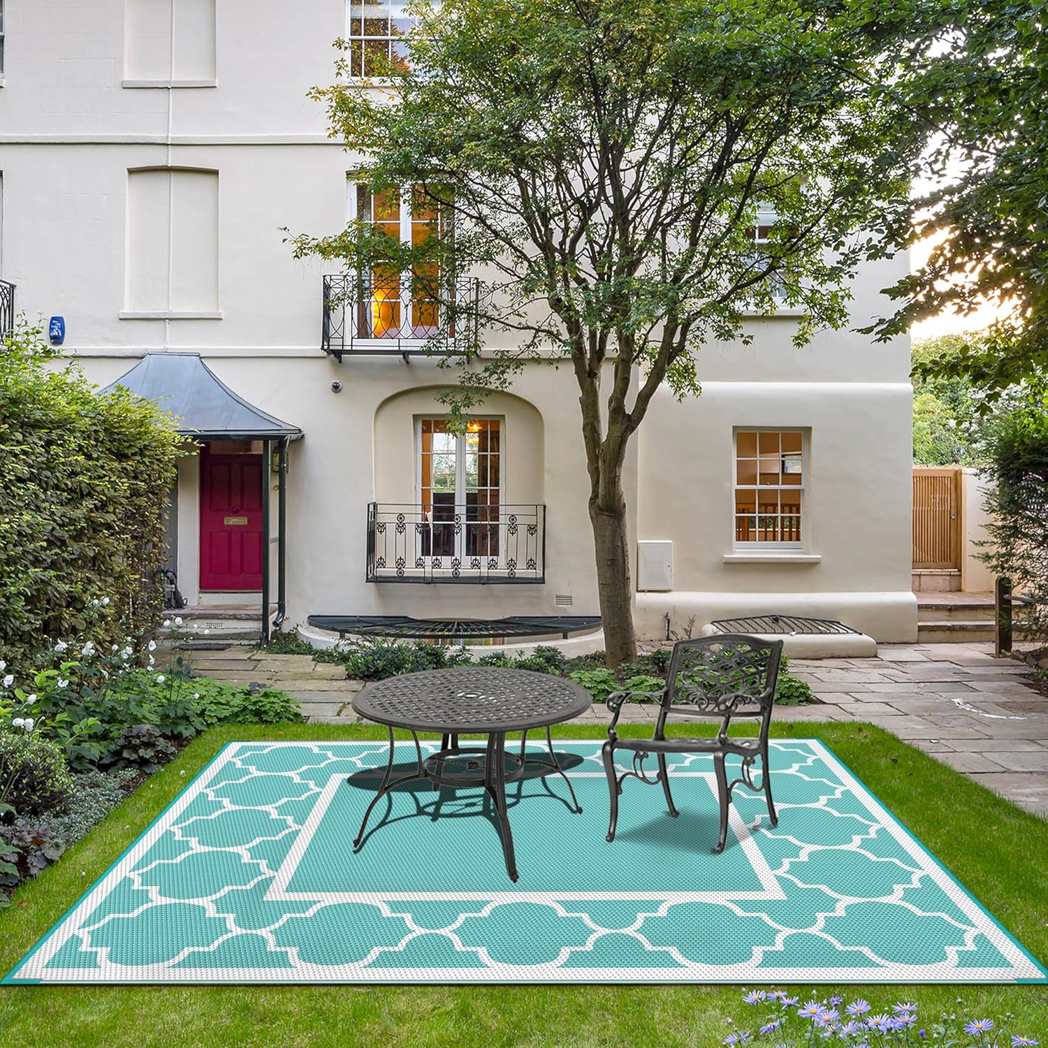GENIMO 6' x 9' Outdoor Rug Waterproof for Patio Decor, Reversible Plastic Straw Area Mats Carpet for Camper Clearance, Outside Carpet for Rv, Deck, Porch, Beach, Balcony, Aqua Blue & White
