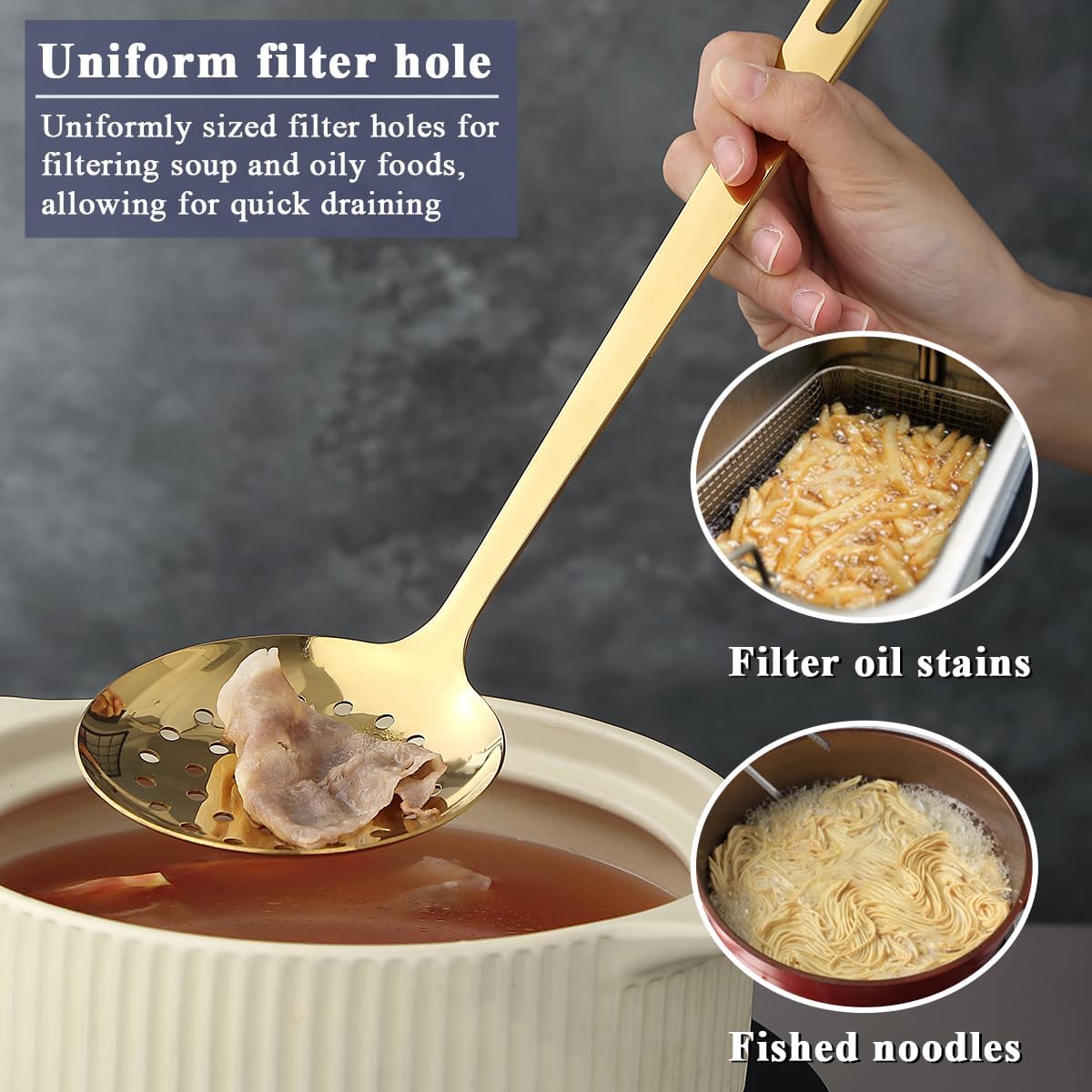 - 5. Effortless Cleaning and Storage:Enjoy the convenience of dishwasher - safe utensils that resist stains and odors, thanks to their polished surface. The built - in hanging holes allow for easy storage on hooks or racks, keeping your kitchen organized and maintaining the set's luxurious look.