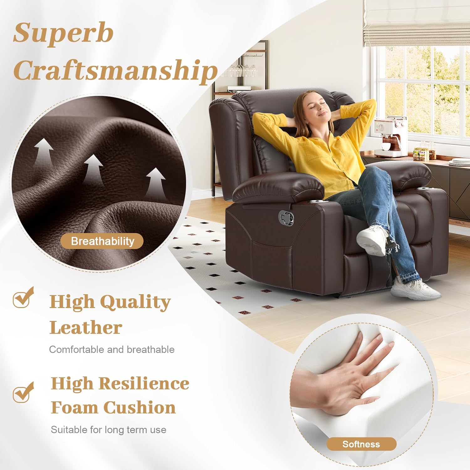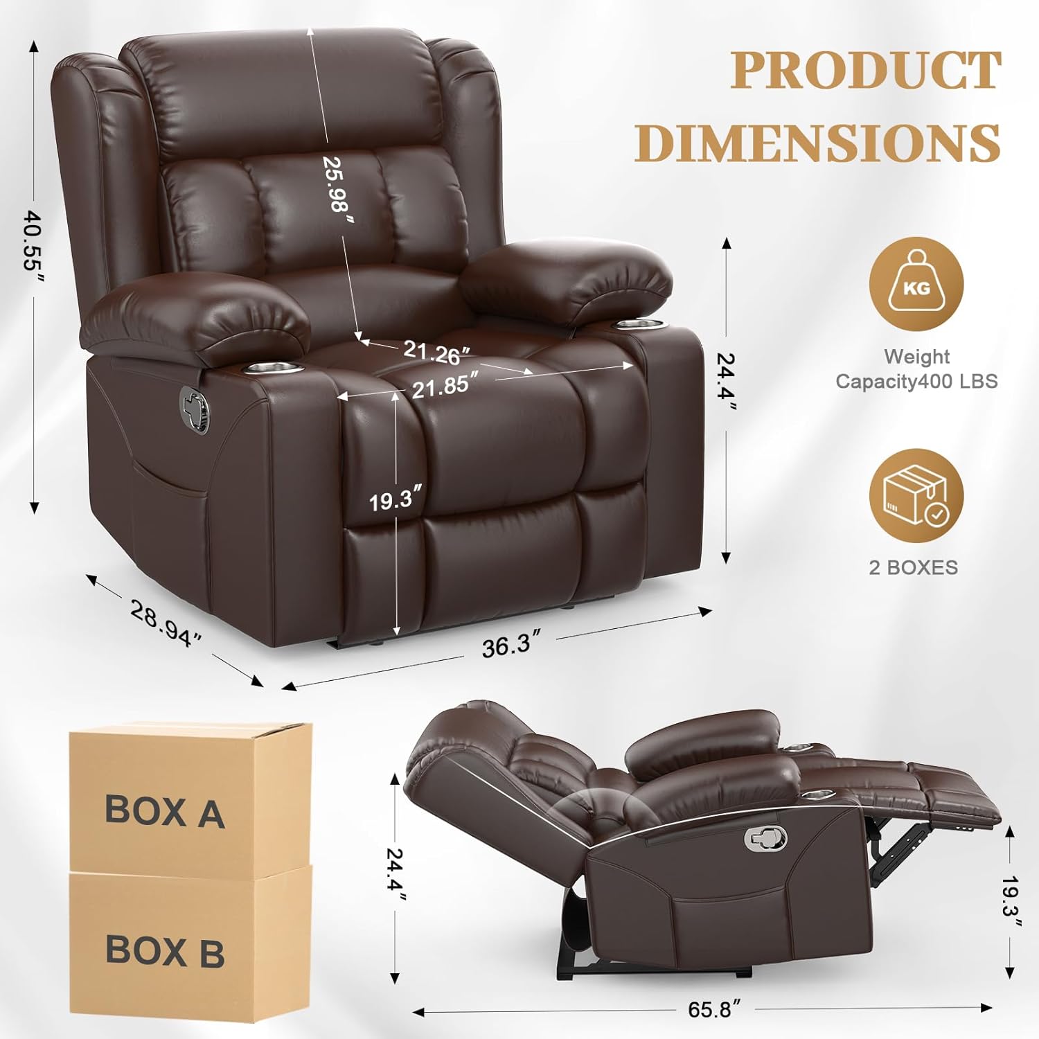 Recliner Chair for Adults, Oversized PU Leather Manual Pull Tab Reclining Chair with Cup Holders, Minimalist Style Single Sofa for Living Room, RV (Brown)