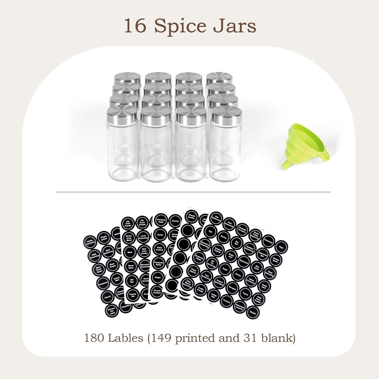 - 【All-Inclusive Set】Includes 16 airtight glass jars, funnel, 180 lables(149 printed and 31 blank), functional kitchen spice organizer.