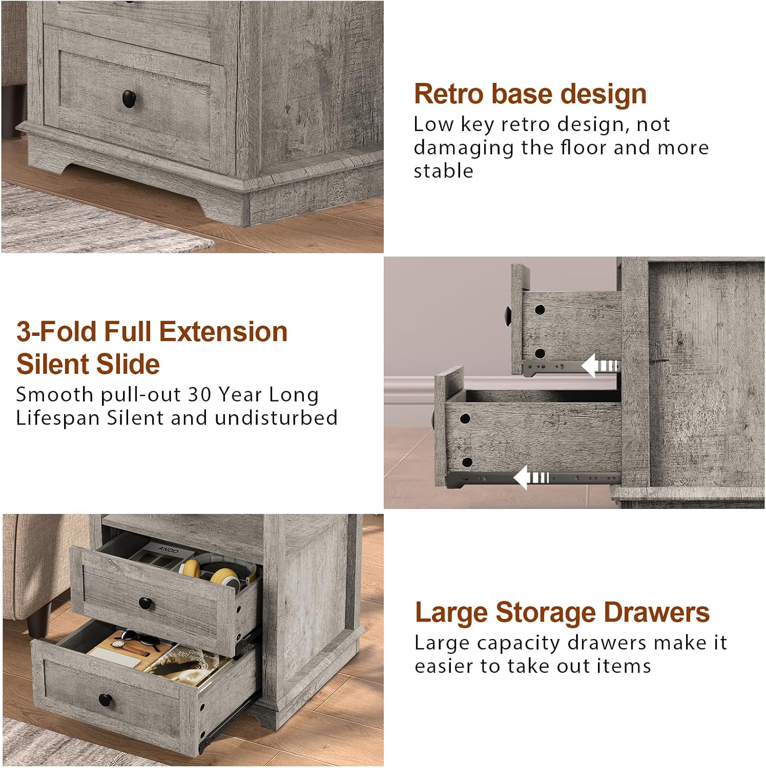 - 2 Drawers:The open compartment beneath the tabletop, coupled with 2 large drawers, offers ample storage space to keep your area organized and clutter-free. The end table features high-quality metal silent slides, ensuring each drawer opens with a smooth, gentle motion.