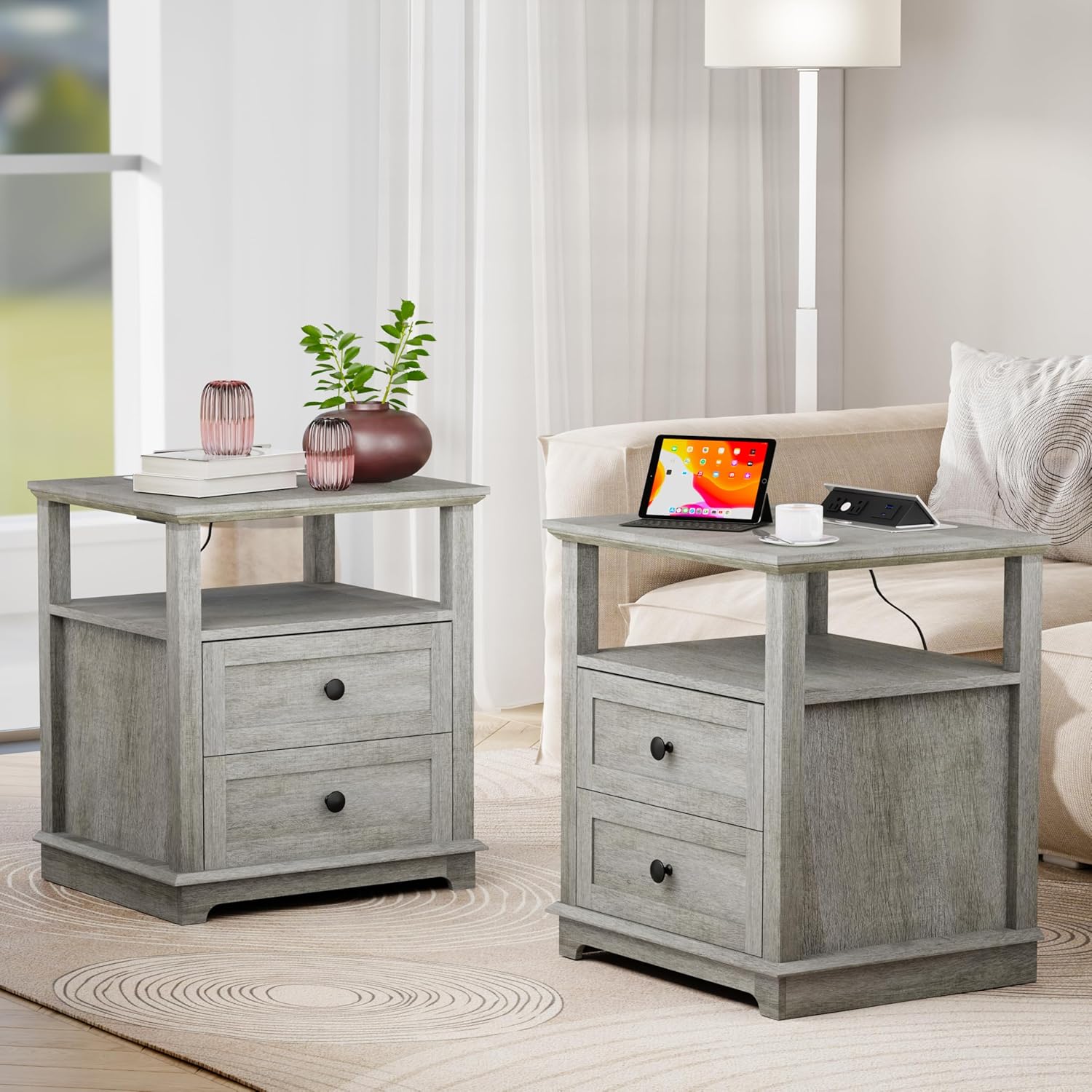 HIFYOBRO Large End Table Set of 2, 2 Drawers and Hidden Charging Station, Type-C & USB Port & Power outlets, Wooden End Table, Side Table with Storage for Living Room and Bedroom