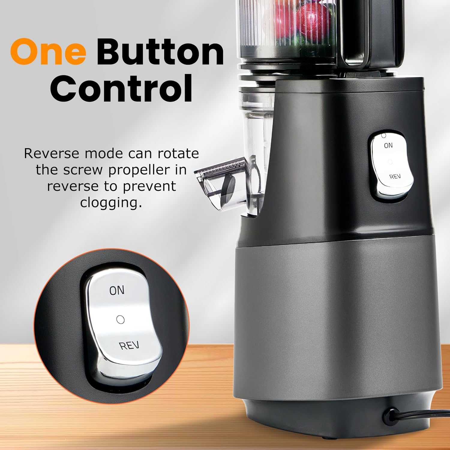 - 【ONE BUTTON CONTROL】One-button design makes your juicing process as simple as possible. There is a reverse mode, if the blockage occurs in the juicing process, just filpping the button can make the juicer rotate in the opposite direction, clear the blockage, and ensure that the juicing is uninterrupted. In the juicing process, if the lid is accidentally opened, the masticating juicer will automatically stop working, and the juicer will not start if the lid is not covered, to ensure the safety of the user
