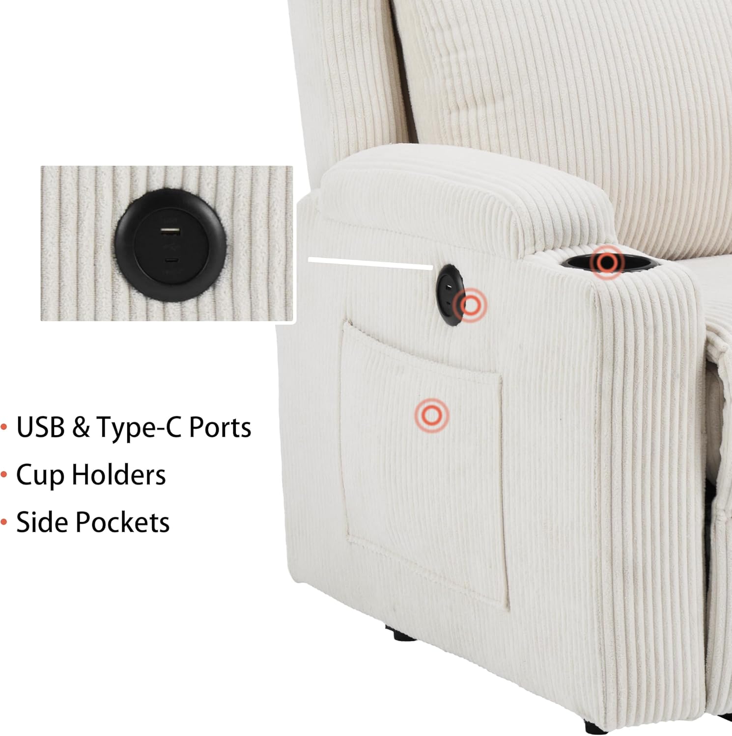 - ăPreferred Corduroy Fabrică: The recliner chair for the elderly is made of high-quality corduroy fabric, cut as a whole and precision hand-sewn. The fabric is thick and the fiber structure is tight and not easy to wear. The surface velvet strips have a unique texture and retro style, adding to the beauty of your living room or bedroom.There are also USB & Type-C charging ports on the side of the chair for your convenience.