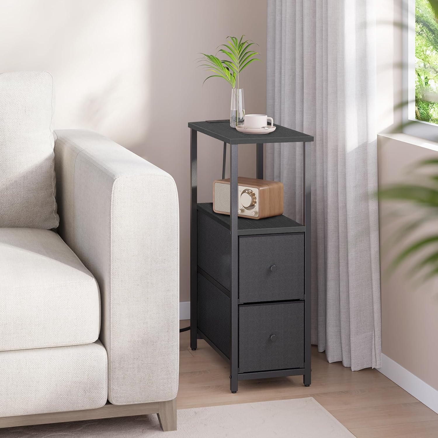 TUTOTAK Small Narrow End Table with Charging Station, Side Table with Outlets, Nightstand with 2 Cloth Drawers, Couch Table, for Living Room, Bedroom, Bedside, Black TB01BK085