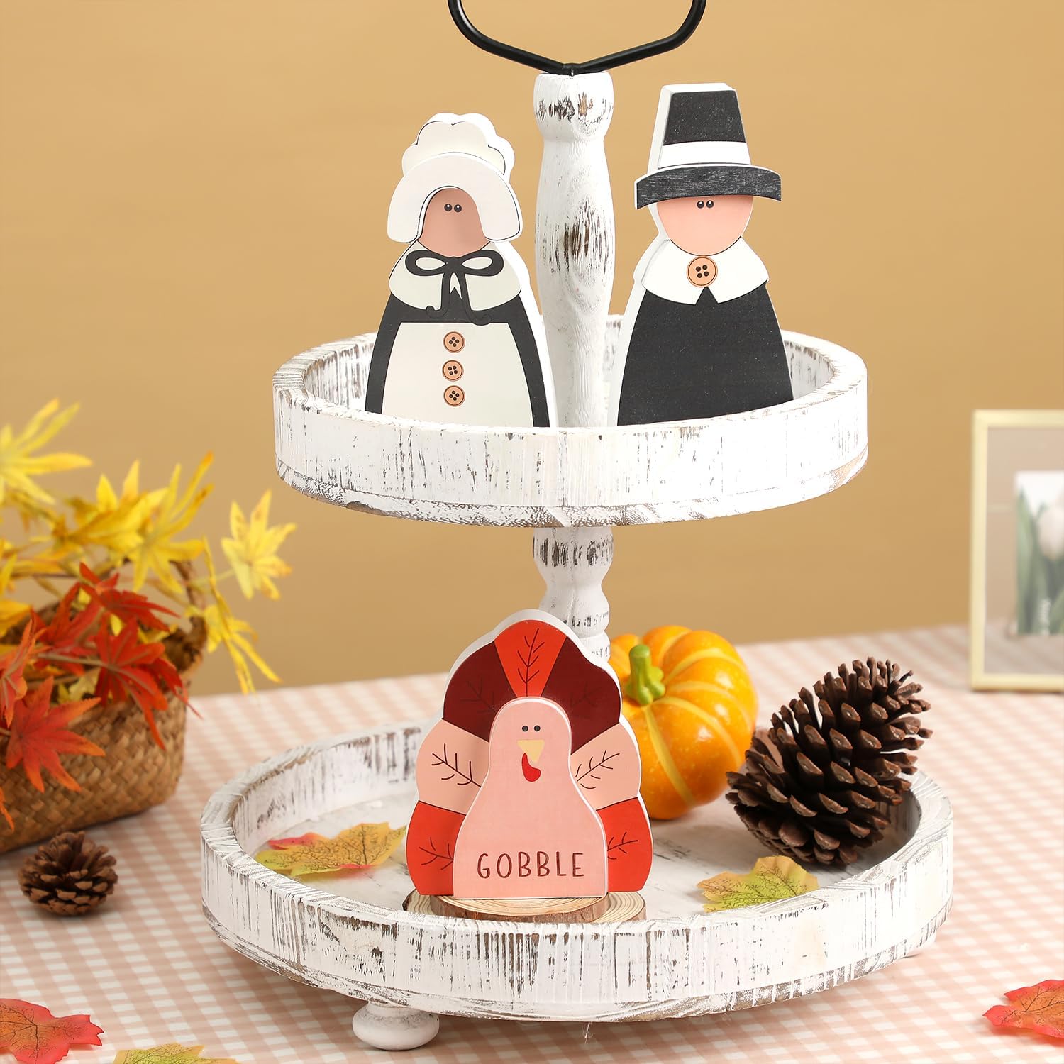 Amorita Fall Thanksgiving Decorations Wooden Turkey Pilgrim Couple Table Sign 3 Pcs Fall Thanksgiving Decor Standing Tabletop Sign Decor for Autumn Harvest - W