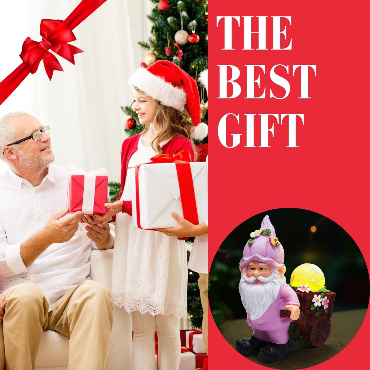 - Charming Gnome with a Magical Glow – Add a playful touch to your garden with this adorable pink gnome pulling a cart that carries a solar-powered crackle glass globe. It brings storybook magic and cheerful personality to any outdoor space.