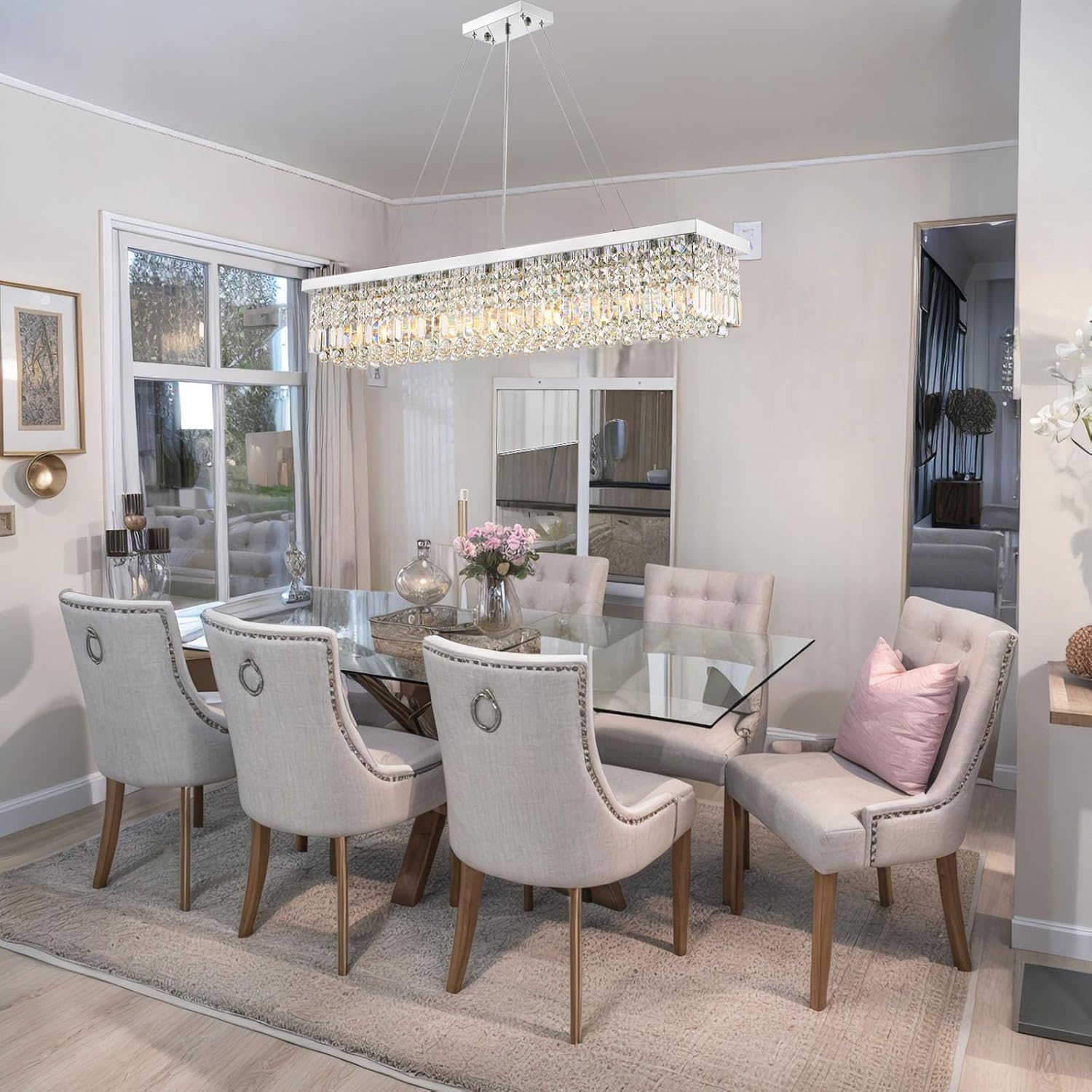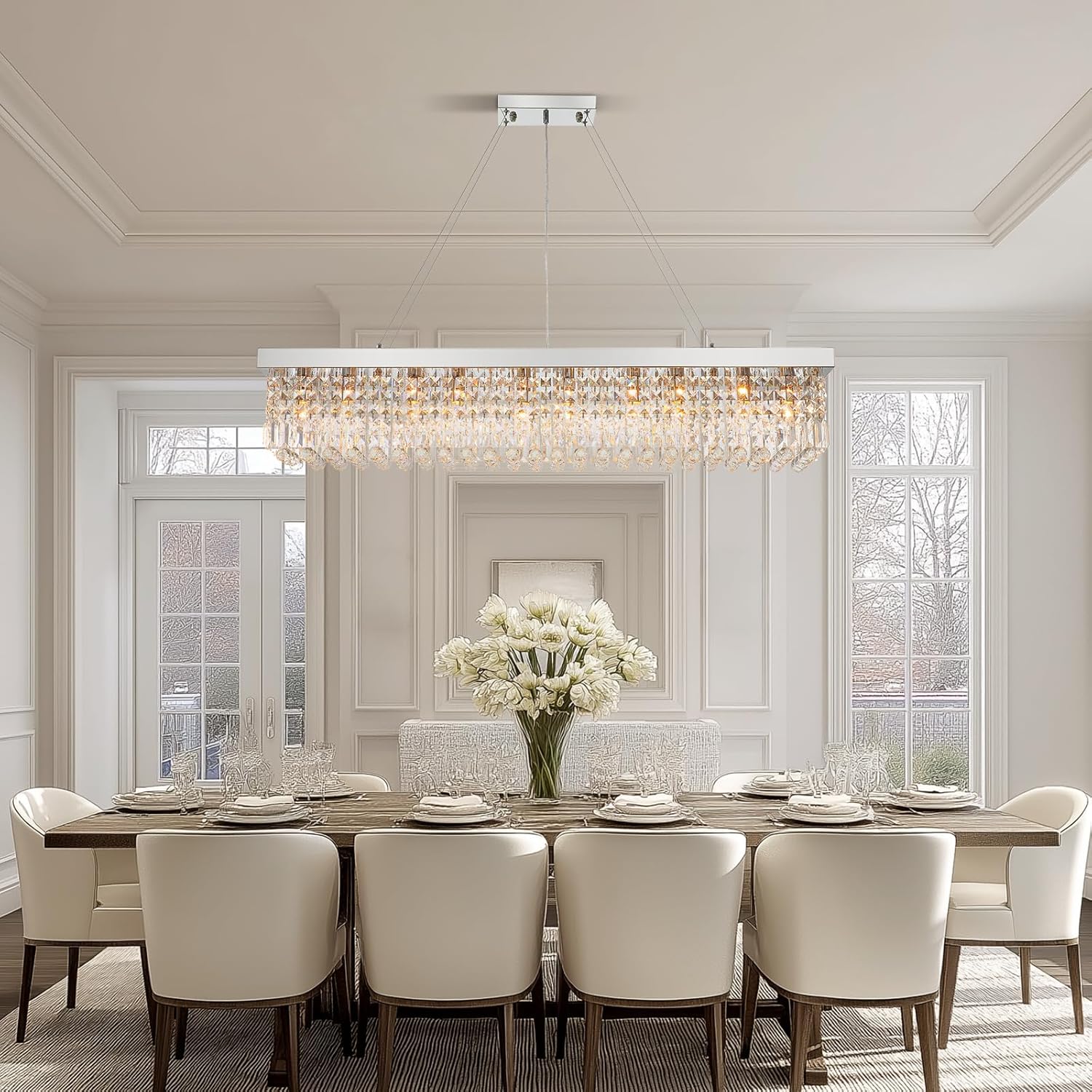 - RECTANGLE CRYSTAL CHANDELIERS: Adorned with top-grade K9 crystals and a gleaming chrome-plated frame, this piece creates a breathtaking display of light. The rectangular crystal chandelier boasts a mirror-like chrome finish that amplifies each crystalโs sparkle, resulting in a true luxury crystal chandelier that outshines other crystal chandeliers in brilliance.
