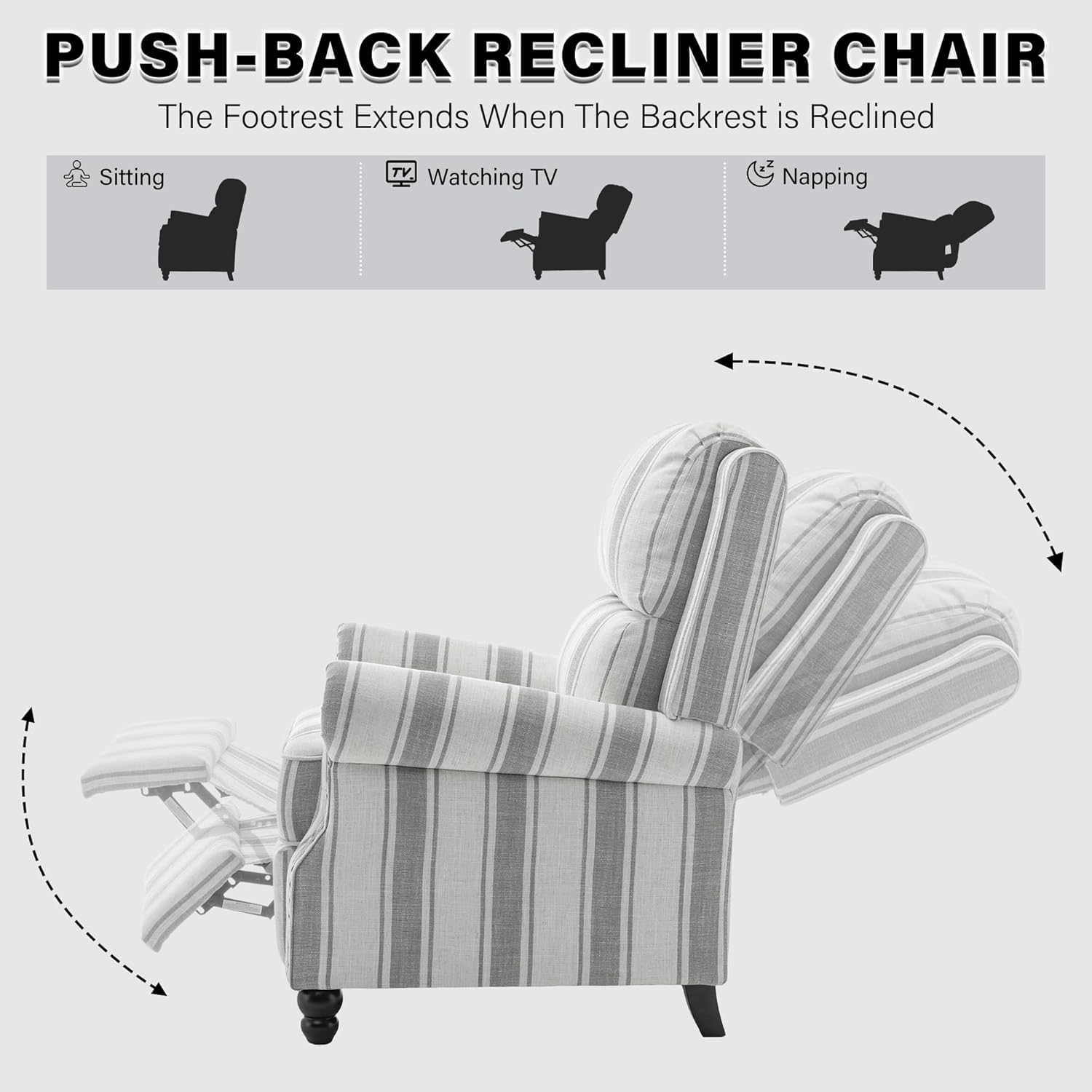 UIXE Pushback Recliner Chair Push Back Accent Chair, Fabric Overstuffed Armchair for Living Room, Rivet Trim Club Chair Home Theater Single Sofa Bedroom Reading Seat - Stripe Gray