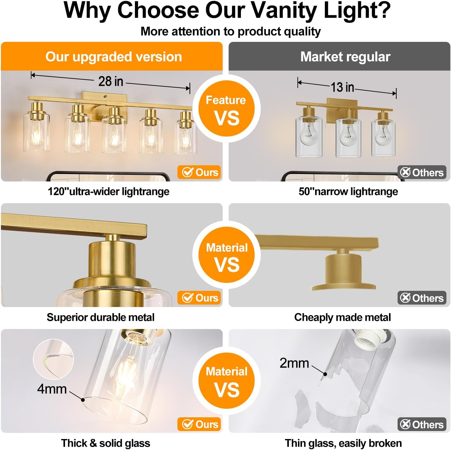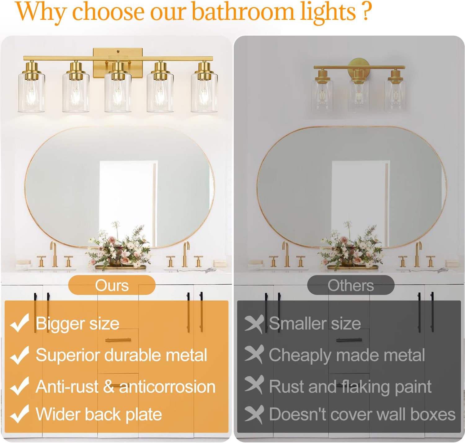 - Elegant Brushed Gold Design: Elevate your space with this brushed gold bathroom light fixture, featuring a sleek brushed gold lamp body and clear glass shades. The upgraded finish includes a scratch-resistant and tarnish-resistant coating, ensuring it retains its luxurious appearance over time. Perfect for modern, farmhouse, or traditional decor, it’s a versatile addition to any home.